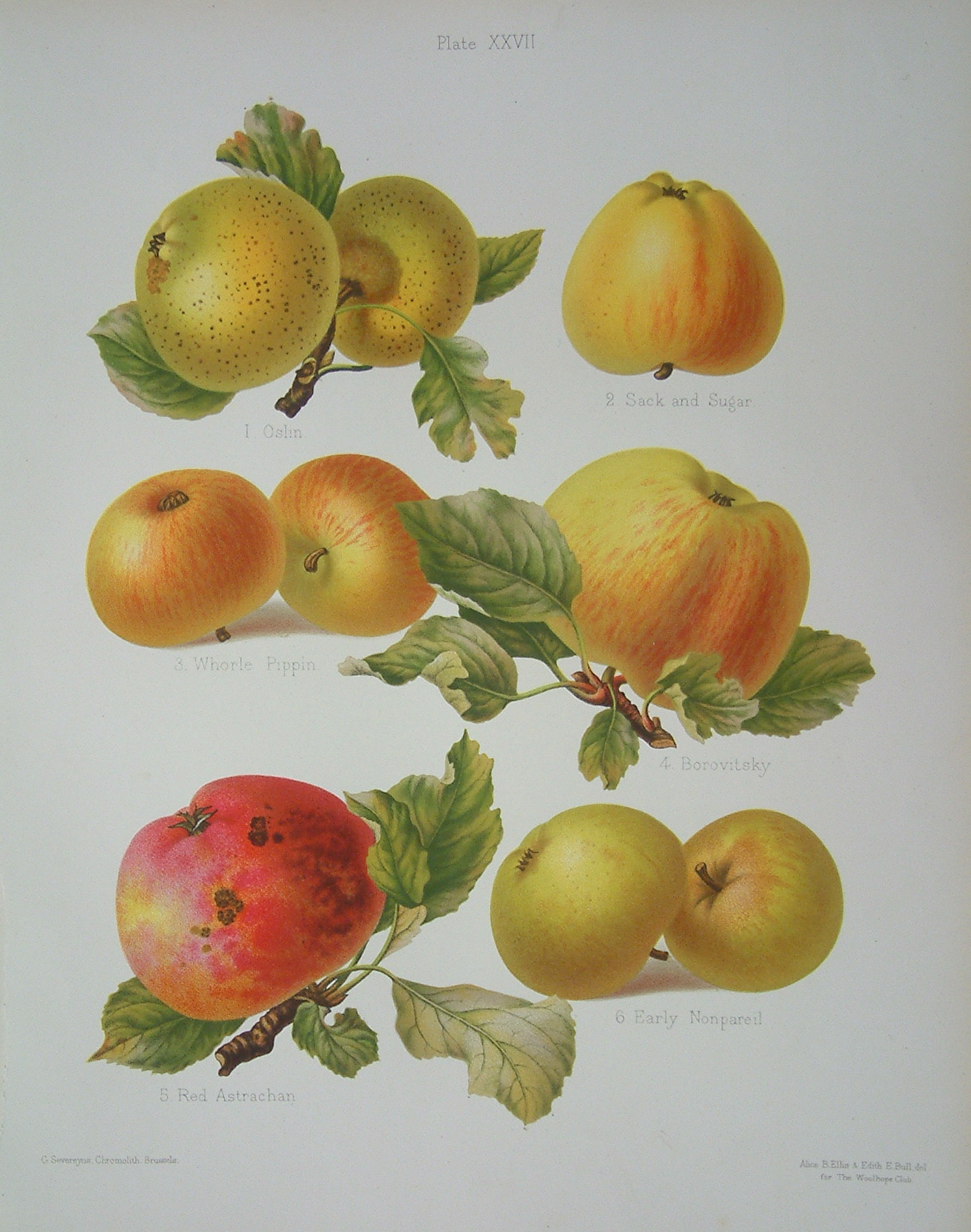 The Woolhope Naturalists’ Field Club was based in Hereford, the capital of a county famous for its apples and pears. The Club’s Pomology Committee was headed by the Reverend Charles Henry Bulmer whose sons in 1887 founded the company which today is now the largest cider-maker in the world. In 1876 the Club considered publishing a ‘Herefordshire Pomona’ and collected 1200 plates for two exhibitions. From these a selection was made for which further descriptions were required. The first of seven parts was published in the autumn of 1878 and following issues were approximately every year until 1885. The artists used all eight autumn seasons and their sunny hours to record 432 varieties of apples and pears. The descriptions were the work of Doctor Robert Hogg (1818-97) with the various introductory material being the work of the overall editor Doctor Henry Graves Bull (c.1818-85). It is considered a vital book in the history of each variety. ‘An Oak Spring Pomona’ (1990) pp. 218-222.