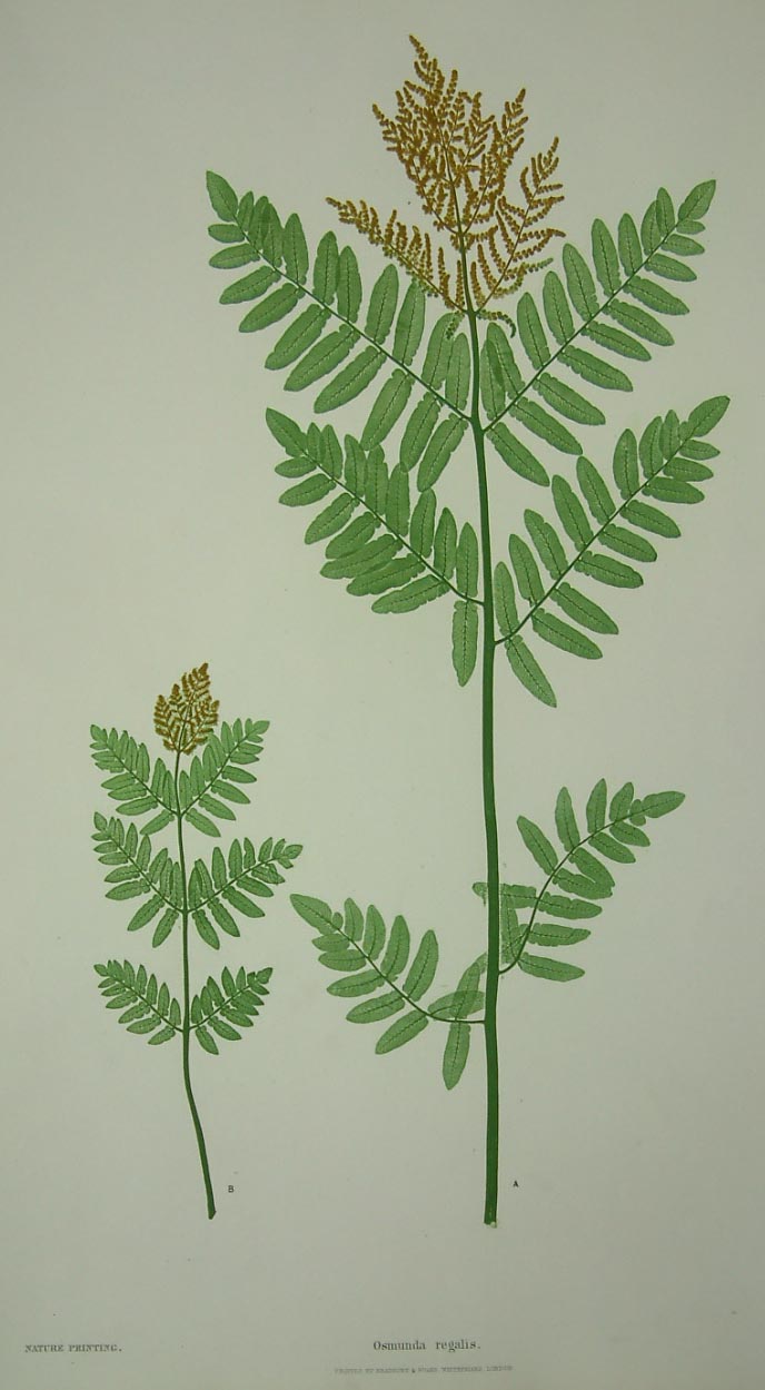 The ‘Ferns of Great Britain and Ireland’ was written by Thomas Moore (1821-87), who was the curator of the Chelsea Botanic Garden and edited by John Lindley (1799-1865). Henry Bradbury (1829-60) was the eldest son of William Bradbury of Bradbury & Evans, printers and publishers. In 1850 Henry Bradbury went to Vienna to study at the Imperial printing office where he learnt of nature printing, where impressions of natural objects are made on printing plates. Back in London he used a similar process to produce the plates for Moore’s work on ferns. This famous book was one of the first nature-printed books produced in Britain. There were numerous claims to the patent and invention of the technique and Bradbury was heavily embroiled in it all. So much so that it is quite possible that it led to his early death when he committed suicide by drinking acid. Fischer (1933) 89-91; Nissen BBI (1966) 1400; ODNB; Stafleu & Cowan (1976-86) 6275.