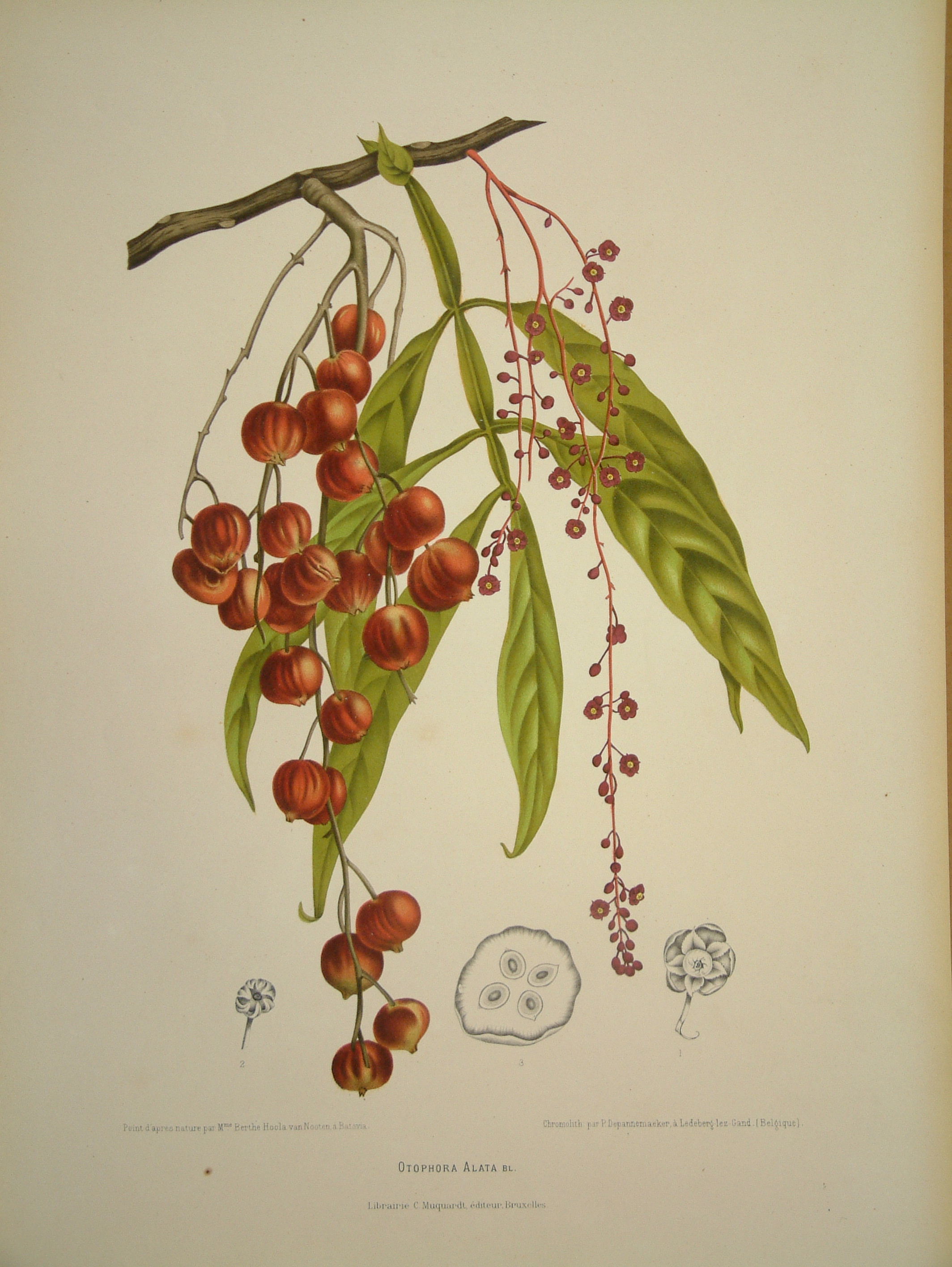 Berthe Hoola van Nooten (1817-92) was collecting the material for this book in Java during the early 1860s. The plates for the ‘Fleurs Fruits et Feuillages choisis de l’Ile de Java’ were the work of P. Depannamaeker and are some of the first to use the new technology of chromolithography. The plates could not be better described than thus: ‘Van Nooten was clearly a more than competent artist, for the splendid tropical plants, with their lush foliage, vividly coloured flowers and exotic fruit have been depicted with great skill. She managed to accentuate the splendour of each species by adopting a style that combined great precision and clarity with a touch of neo-Baroque exuberance, revelling in the rich forms and colours of the tropics.’ Nissen BBI (1966) 931; Stafleu & Cowan TL2 (1976-86) 3025; ‘ Oak Spring Flora’ (1997) p. 330.