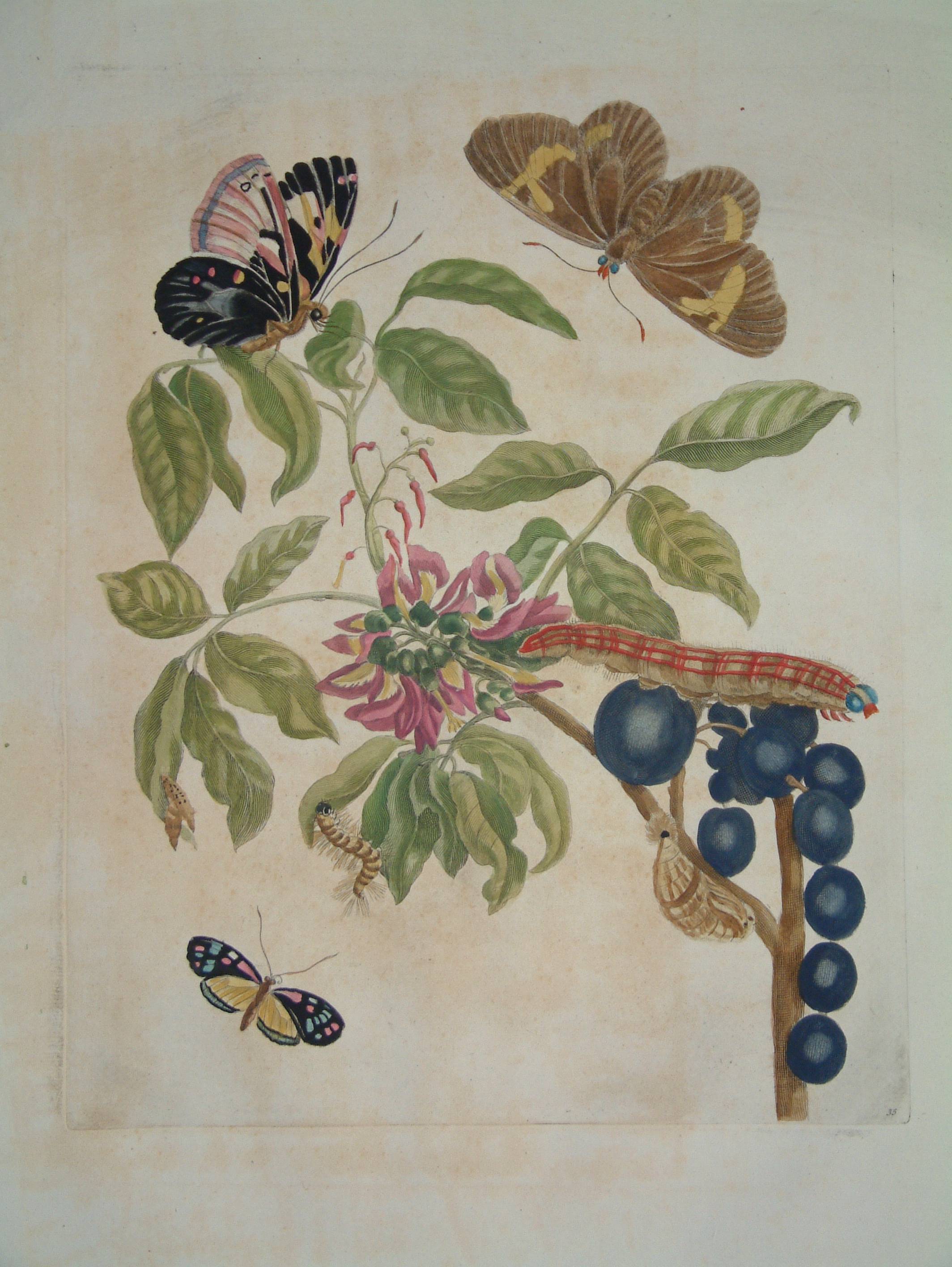 Maria Sibylla Merian (1647-1717) is most famous for two published works, the ‘Dissertatio de Generatione et Metamorphosibus Insectorum Surinamensium’ first published in 1705 and ‘De Europische Insecten’ of 1730, both published in Amsterdam. Maria was the daughter of Matthias Merian (1593-1650) a noted engraver and publisher. She devoted her life to the study of insects and their metamorphoses. Noting the fascinating insects returning from the Dutch colony in South America, she set sail with her daughter Dorothea in 1699 for Surinam where she remained until 1701. Her work was the first to show the European public the beauty and wealth of the insect life in the region. The various stages of caterpillar and butterfly are all shown amongst native flora and fruiting plants. The daughter Maria returned to Surinam to complete with work which was expanded with 12 further plates and published two years after her mother’s death in 1719. A third edition appeared in 1726. Dunthorne (1938) 205; ‘Great Flower Books’ (1956) p. 67; Hunt (1958) 467; Landwehr (1976) 131; Nissen (1966) 1341.