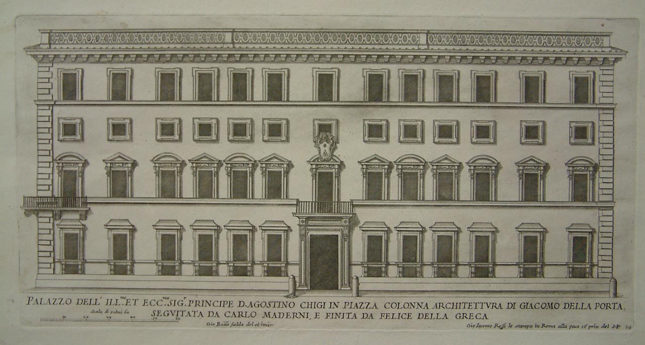 The ‘Palazzi di Roma’ was published in Rome c.1655-1670 in two parts. The first part was published by Pietro Ferrerio (c.1600-1654) c.1655. Part two is a continuation by Giovanni Battista Falda (fl.1648-1678). The beautifully engraved plates are by various engravers including Ferrerio, Falda and Antonio Barbey. They feature the Palazzo’s of Rome and are attractively designed to display the facades. It is the first publication to provide accurate scaled illustrations of the Roman Palazzi. Berlin Catalogue (1939) 2665; Brunet (1860-80) II, 1235; Cicognara (1931) 3719; Fowler (1961) 120.
