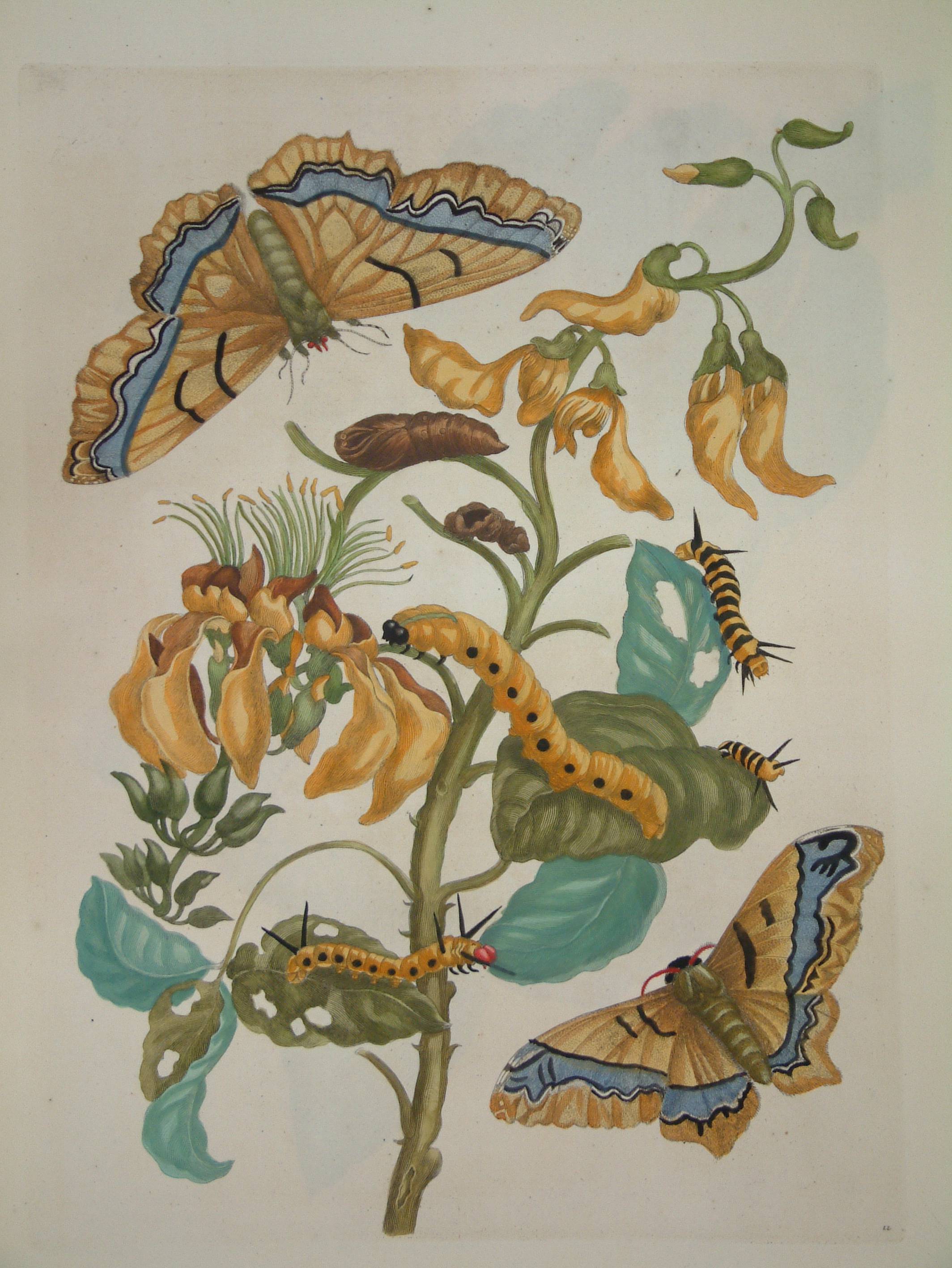 Maria Sibylla Merian (1647-1717) is most famous for two published works, the ‘Dissertatio de Generatione et Metamorphosibus Insectorum Surinamensium’ first published in 1705 and ‘De Europische Insecten’ of 1730, both published in Amsterdam. Maria was the daughter of Matthias Merian (1593-1650) a noted engraver and publisher. She devoted her life to the study of insects and their metamorphoses. Noting the fascinating insects returning from the Dutch colony in South America, she set sail with her daughter Dorothea in 1699 for Surinam where she remained until 1701. Her work was the first to show the European public the beauty and wealth of the insect life in the region. The various stages of caterpillar and butterfly are all shown amongst native flora and fruiting plants. The daughter Maria returned to Surinam to complete with work which was expanded with 12 further plates and published two years after her mother’s death in 1719. A third edition appeared in 1726. Dunthorne (1938) 205; ‘Great Flower Books’ (1956) p. 67; Hunt (1958) 467; Landwehr (1976) 131; Nissen (1966) 1341.