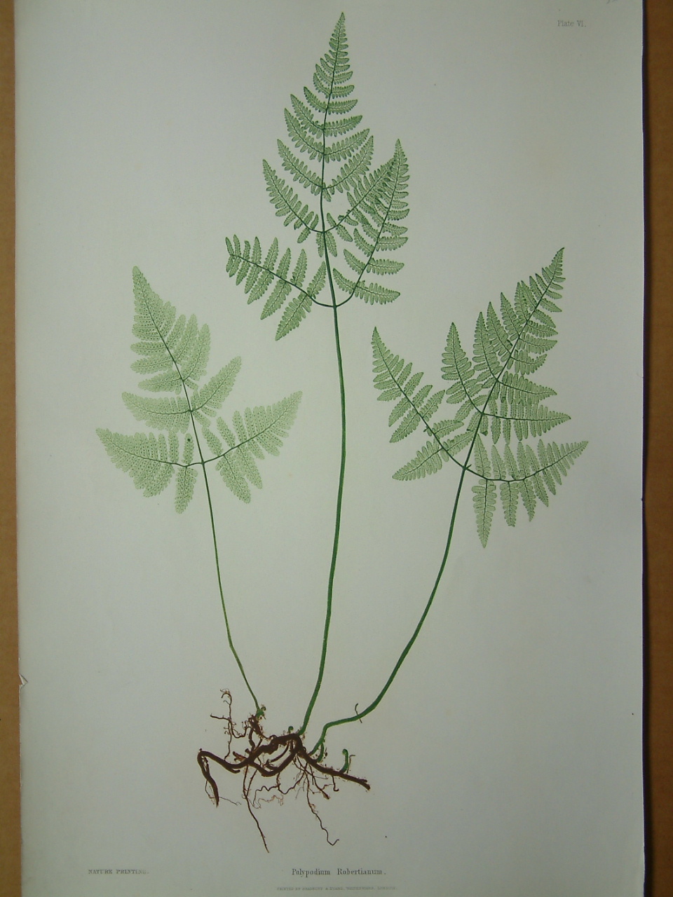 The ‘Ferns of Great Britain and Ireland’ was written by Thomas Moore (1821-87), who was the curator of the Chelsea Botanic Garden and edited by John Lindley (1799-1865). Henry Bradbury (1829-60) was the eldest son of William Bradbury of Bradbury & Evans, printers and publishers. In 1850 Henry Bradbury went to Vienna to study at the Imperial printing office where he learnt of nature printing, where impressions of natural objects are made on printing plates. Back in London he used a similar process to produce the plates for Moore’s work on ferns. This famous book was one of the first nature-printed books produced in Britain. There were numerous claims to the patent and invention of the technique and Bradbury was heavily embroiled in it all. So much so that it is quite possible that it led to his early death when he committed suicide by drinking acid. Fischer (1933) 89-91; Nissen BBI (1966) 1400; ODNB; Stafleu & Cowan (1976-86) 6275.