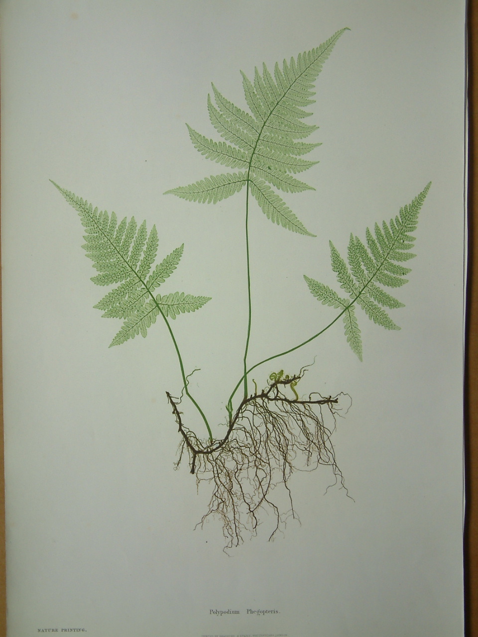 The ‘Ferns of Great Britain and Ireland’ was written by Thomas Moore (1821-87), who was the curator of the Chelsea Botanic Garden and edited by John Lindley (1799-1865). Henry Bradbury (1829-60) was the eldest son of William Bradbury of Bradbury & Evans, printers and publishers. In 1850 Henry Bradbury went to Vienna to study at the Imperial printing office where he learnt of nature printing, where impressions of natural objects are made on printing plates. Back in London he used a similar process to produce the plates for Moore’s work on ferns. This famous book was one of the first nature-printed books produced in Britain. There were numerous claims to the patent and invention of the technique and Bradbury was heavily embroiled in it all. So much so that it is quite possible that it led to his early death when he committed suicide by drinking acid. Fischer (1933) 89-91; Nissen BBI (1966) 1400; ODNB; Stafleu & Cowan (1976-86) 6275.