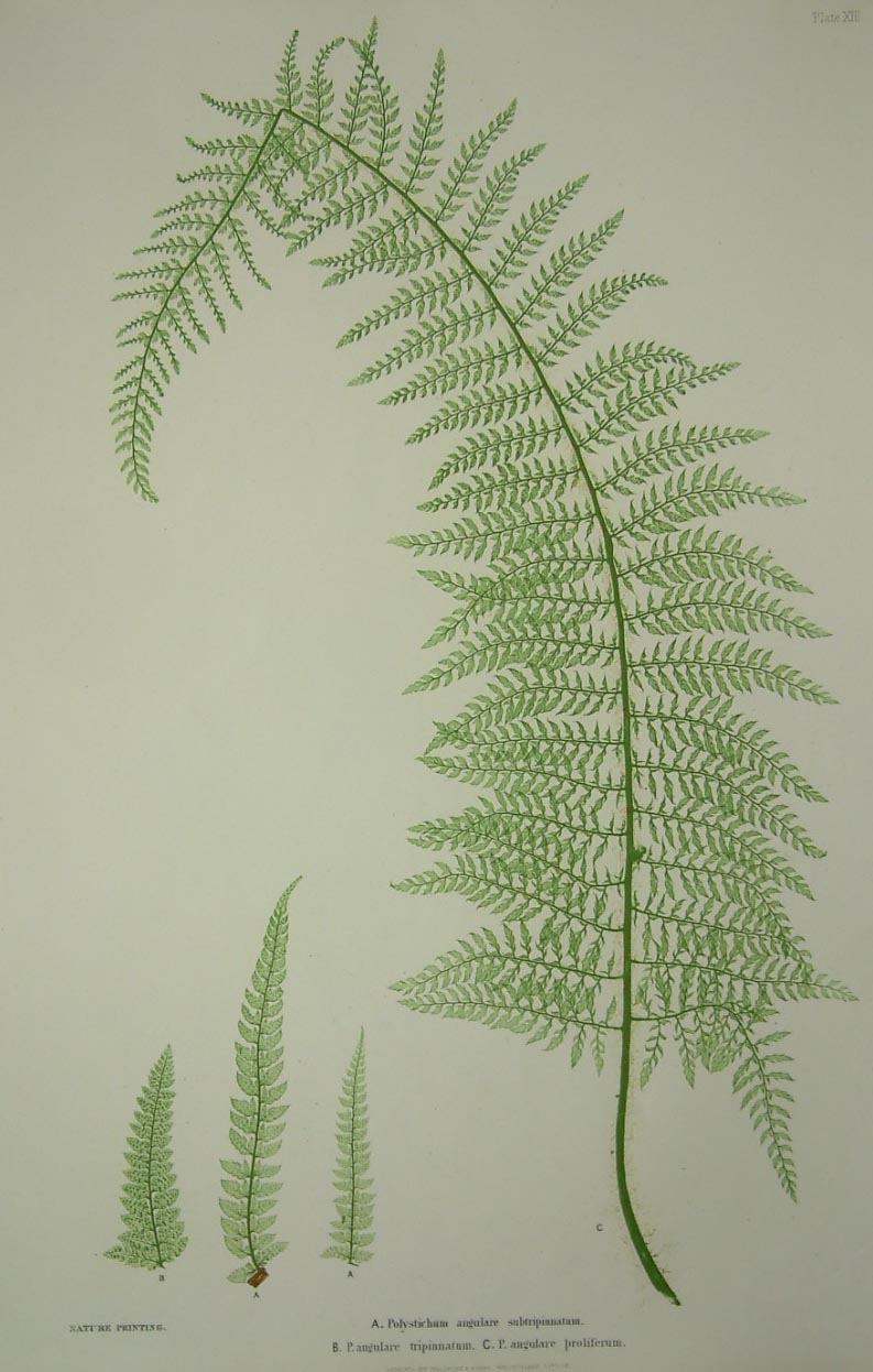 The ‘Ferns of Great Britain and Ireland’ was written by Thomas Moore (1821-87), who was the curator of the Chelsea Botanic Garden and edited by John Lindley (1799-1865). Henry Bradbury (1829-60) was the eldest son of William Bradbury of Bradbury & Evans, printers and publishers. In 1850 Henry Bradbury went to Vienna to study at the Imperial printing office where he learnt of nature printing, where impressions of natural objects are made on printing plates. Back in London he used a similar process to produce the plates for Moore’s work on ferns. This famous book was one of the first nature-printed books produced in Britain. There were numerous claims to the patent and invention of the technique and Bradbury was heavily embroiled in it all. So much so that it is quite possible that it led to his early death when he committed suicide by drinking acid. Fischer (1933) 89-91; Nissen BBI (1966) 1400; ODNB; Stafleu & Cowan (1976-86) 6275.