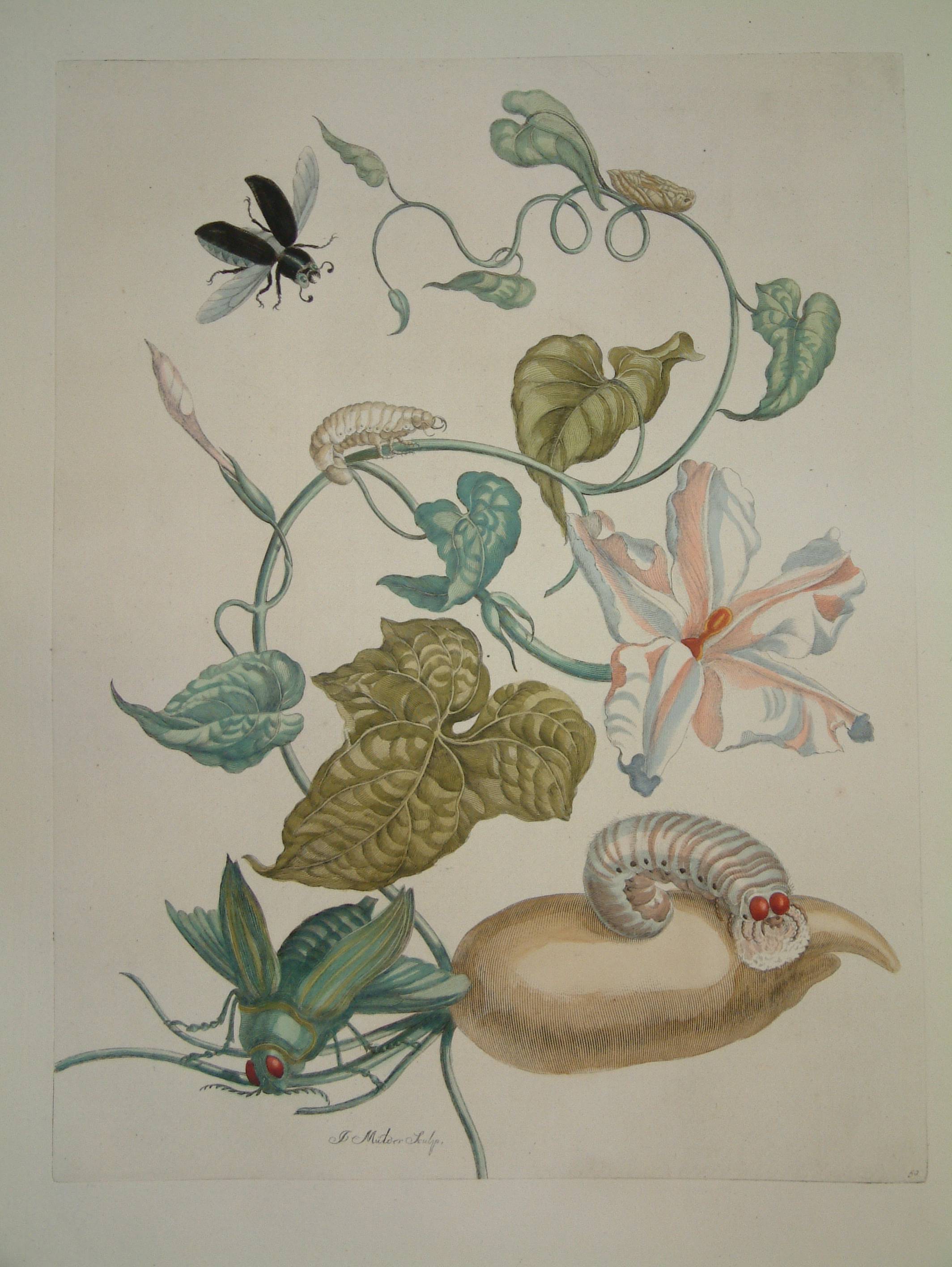 Maria Sibylla Merian (1647-1717) is most famous for two published works, the ‘Dissertatio de Generatione et Metamorphosibus Insectorum Surinamensium’ first published in 1705 and ‘De Europische Insecten’ of 1730, both published in Amsterdam. Maria was the daughter of Matthias Merian (1593-1650) a noted engraver and publisher. She devoted her life to the study of insects and their metamorphoses. Noting the fascinating insects returning from the Dutch colony in South America, she set sail with her daughter Dorothea in 1699 for Surinam where she remained until 1701. Her work was the first to show the European public the beauty and wealth of the insect life in the region. The various stages of caterpillar and butterfly are all shown amongst native flora and fruiting plants. The daughter Maria returned to Surinam to complete with work which was expanded with 12 further plates and published two years after her mother’s death in 1719. A third edition appeared in 1726. Dunthorne (1938) 205; ‘Great Flower Books’ (1956) p. 67; Hunt (1958) 467; Landwehr (1976) 131; Nissen (1966) 1341.