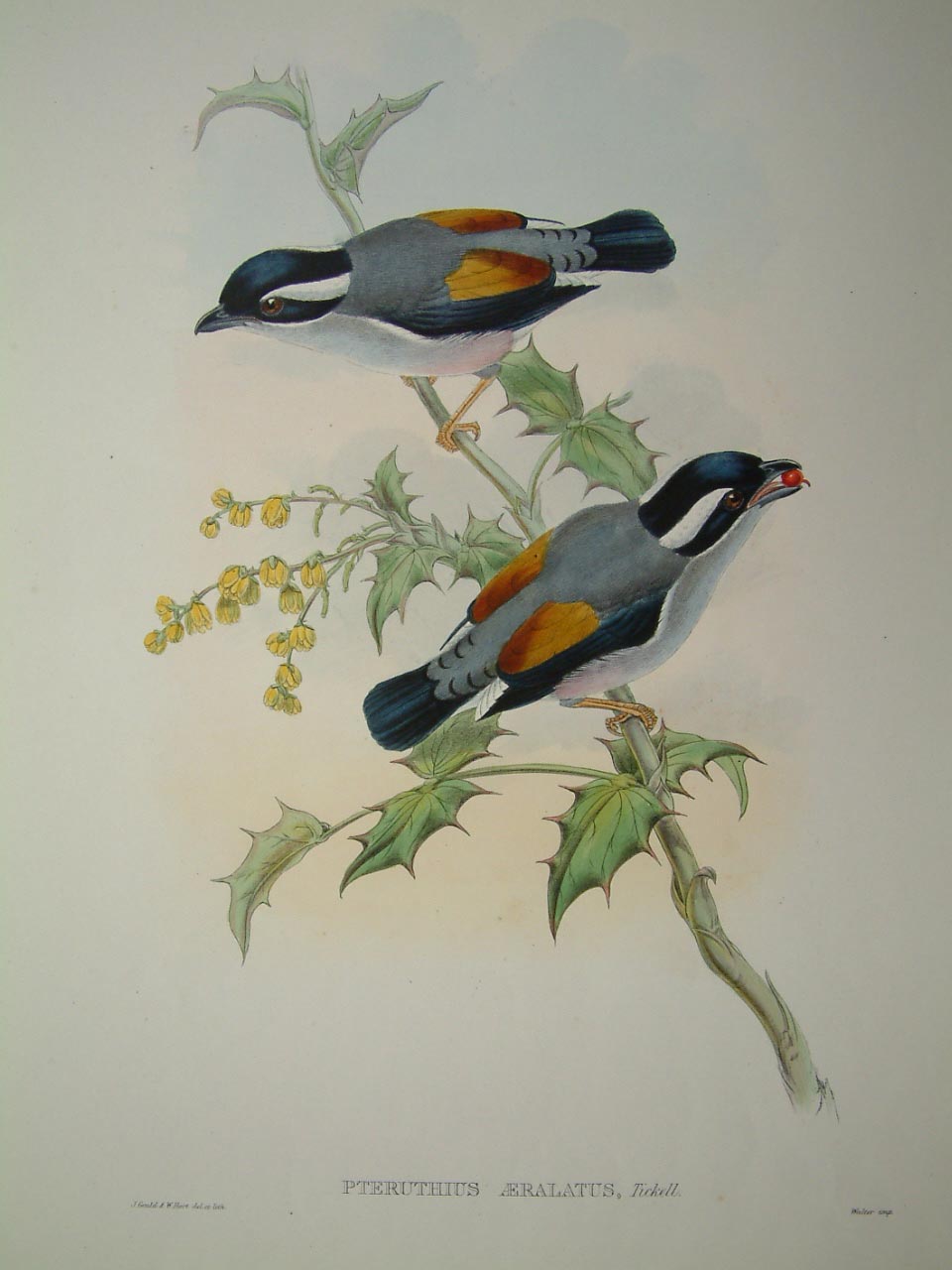 John Gould was born in Lyme, England in 1804, the son of a gardener. With no formal education at the age of 14, he followed his father into the same trade. In his spare time, he learnt how to preserve and mount specimens and traded some of them with the scholars at nearby Eton College. After a short time as a gardener in Yorkshire he settled in London as a taxidermist. In 1827 he received a position at the Zoological Society as curator. His first book on the birds of the Himalayas was published in 1832 when he was just 26 years old. Gould employed the new technology of lithography, his wife Elizabeth being responsible for the lithographic illustrations and the drawings onto stone. He became a Fellow of the Royal Society and Vice President of the Zoological Society. ‘In the field of natural history, the accomplishments of John Gould in his 76 years of life from 1804 to 1881 are truly monumental. No other ornithologist has ever exceeded the number of Gould’s bird discoveries and the magnitude and splendour of his folio publications.’ (Sauer).