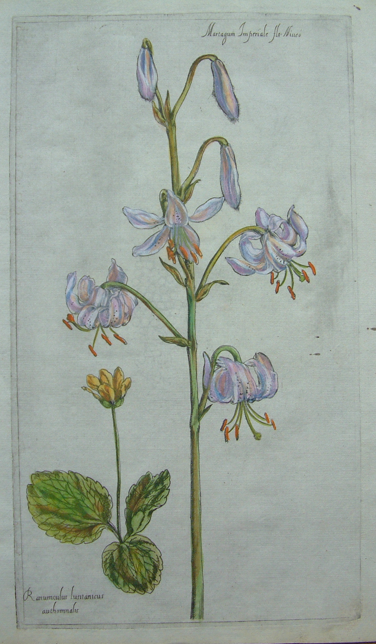 ‘Le Jardin du Roy’ by Pierre Vallet (c.1575-1657) is the first important florilegia to be published. It was printed in Paris, 1608, for Marie de Medici (1575-1642), Henri IV’s consort and intended as a floral pattern book for embroidery. Considering this it is remarkable that they are as natural as they are. Encouragement for the work undoubtedly came from Marie de Medici who missed the wonderful gardens of her beloved Tuscany and surrounded herself with flowers at Court in Paris. Vallet was born in Orléans and soon found himself in the capital where he first worked as an engraver, then a designer of embroidery patterns. Vallet prepared the original drawings and the plates for this work. The engraving was skilfully prepared utilising etching, engraving and stipple methods in their production. Dunthorne (1938) 253; Hunt (1958) 187; Nissen BBI (1966) 2048; ‘Oak Spring Flora’ (1997) no. 8.