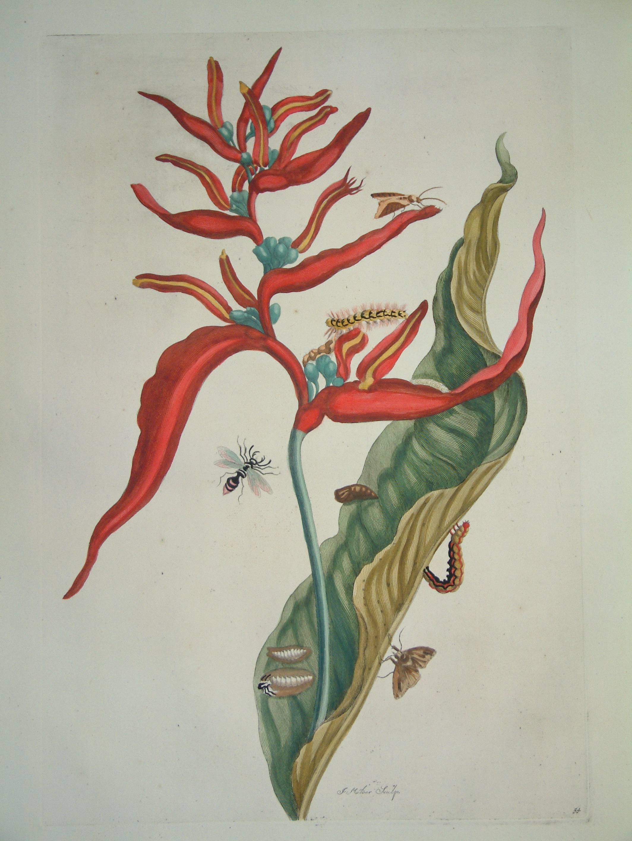 Maria Sibylla Merian (1647-1717) is most famous for two published works, the ‘Dissertatio de Generatione et Metamorphosibus Insectorum Surinamensium’ first published in 1705 and ‘De Europische Insecten’ of 1730, both published in Amsterdam. Maria was the daughter of Matthias Merian (1593-1650) a noted engraver and publisher. She devoted her life to the study of insects and their metamorphoses. Noting the fascinating insects returning from the Dutch colony in South America, she set sail with her daughter Dorothea in 1699 for Surinam where she remained until 1701. Her work was the first to show the European public the beauty and wealth of the insect life in the region. The various stages of caterpillar and butterfly are all shown amongst native flora and fruiting plants. The daughter Maria returned to Surinam to complete with work which was expanded with 12 further plates and published two years after her mother’s death in 1719. A third edition appeared in 1726. Dunthorne (1938) 205; ‘Great Flower Books’ (1956) p. 67; Hunt (1958) 467; Landwehr (1976) 131; Nissen (1966) 1341.
