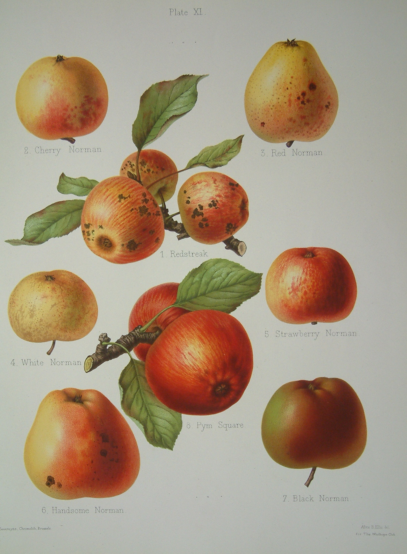 The Woolhope Naturalists’ Field Club was based in Hereford, the capital of a county famous for its apples and pears. The Club’s Pomology Committee was headed by the Reverend Charles Henry Bulmer whose sons in 1887 founded the company which today is now the largest cider-maker in the world. In 1876 the Club considered publishing a ‘Herefordshire Pomona’ and collected 1200 plates for two exhibitions. From these a selection was made for which further descriptions were required. The first of seven parts was published in the autumn of 1878 and following issues were approximately every year until 1885. The artists used all eight autumn seasons and their sunny hours to record 432 varieties of apples and pears. The descriptions were the work of Doctor Robert Hogg (1818-97) with the various introductory material being the work of the overall editor Doctor Henry Graves Bull (c.1818-85). It is considered a vital book in the history of each variety. ‘An Oak Spring Pomona’ (1990) pp. 218-222.