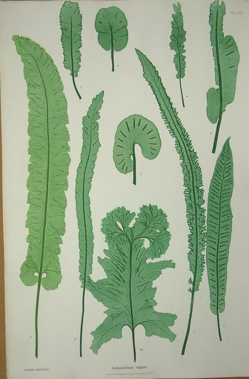 The ‘Ferns of Great Britain and Ireland’ was written by Thomas Moore (1821-87), who was the curator of the Chelsea Botanic Garden and edited by John Lindley (1799-1865). Henry Bradbury (1829-60) was the eldest son of William Bradbury of Bradbury & Evans, printers and publishers. In 1850 Henry Bradbury went to Vienna to study at the Imperial printing office where he learnt of nature printing, where impressions of natural objects are made on printing plates. Back in London he used a similar process to produce the plates for Moore’s work on ferns. This famous book was one of the first nature-printed books produced in Britain. There were numerous claims to the patent and invention of the technique and Bradbury was heavily embroiled in it all. So much so that it is quite possible that it led to his early death when he committed suicide by drinking acid. Fischer (1933) 89-91; Nissen BBI (1966) 1400; ODNB; Stafleu & Cowan (1976-86) 6275.