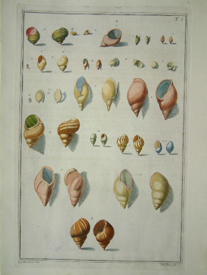 Niccolo Gualtieri (1688-1744) was born in Florence and after a brief period studying in Pisa returned to the city. Here he became a physician, eventually to Cosimo de Medici. His interest in natural history led him to create his own collection. While cabinets of shells were fashionable in court circles, Gualtieri’s collections were particularly impressive and he produced the magnificent ‘Index Testarum Conchyliorum’ in 1742 illustrating hundreds of shells from his own collection. Many of these had been sent by Georg Eberhard Rumphius (1627-1702). The plates were engraved by Giuseppe Menabuoni and Antonio Pazzi. He was also a professor at the University of Pisa. His collections are now in the Museo Storia Naturale di Pisa. Dance (1966) ‘Shell Collecting’ p. 57; Dance (1981) p. 74; Nissen ZBI (1978) 1736.
