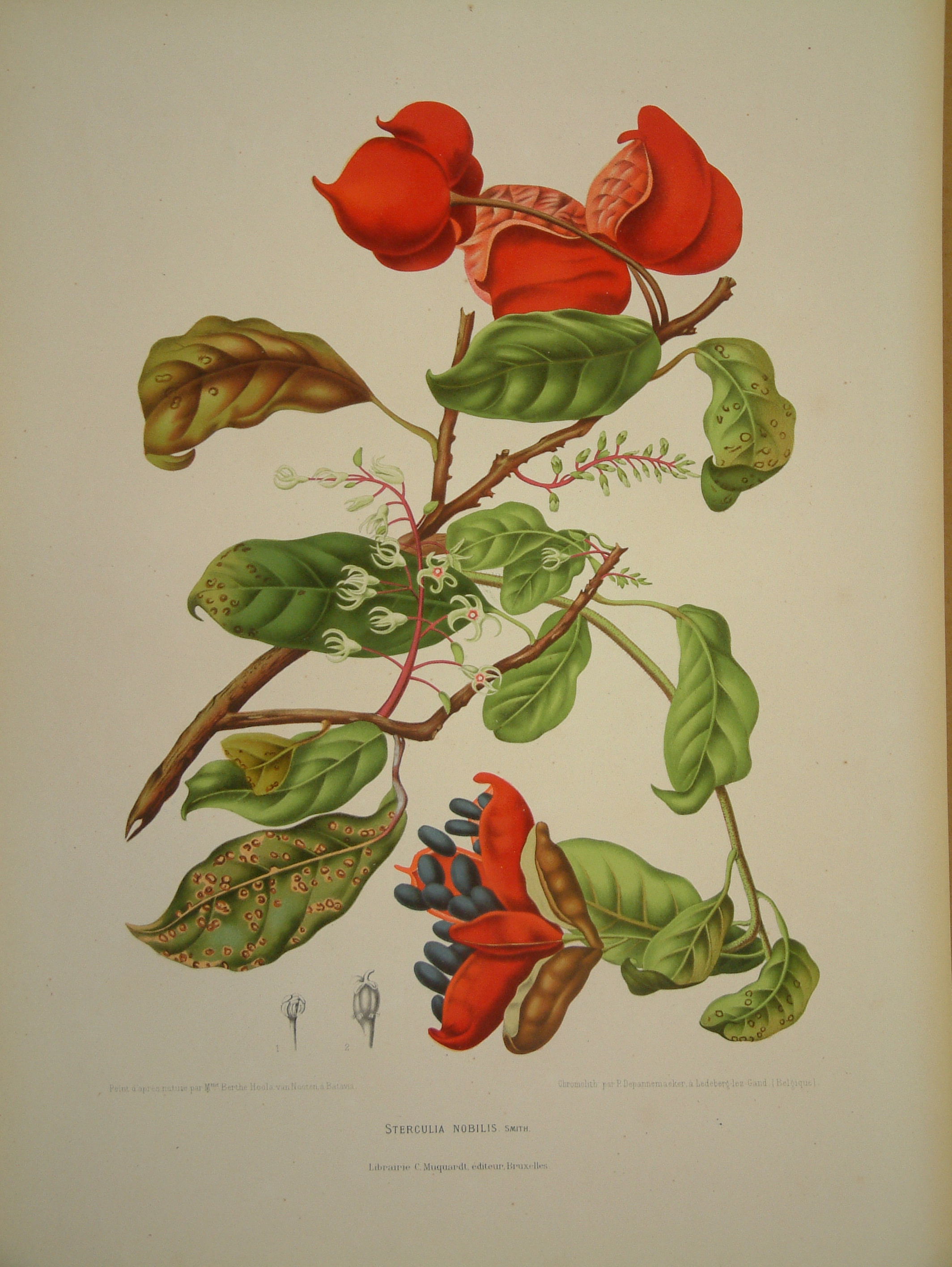 Berthe Hoola van Nooten (1817-92) was collecting the material for this book in Java during the early 1860s. The plates for the ‘Fleurs Fruits et Feuillages choisis de l’Ile de Java’ were the work of P. Depannamaeker and are some of the first to use the new technology of chromolithography. The plates could not be better described than thus: ‘Van Nooten was clearly a more than competent artist, for the splendid tropical plants, with their lush foliage, vividly coloured flowers and exotic fruit have been depicted with great skill. She managed to accentuate the splendour of each species by adopting a style that combined great precision and clarity with a touch of neo-Baroque exuberance, revelling in the rich forms and colours of the tropics.’ Nissen BBI (1966) 931; Stafleu & Cowan TL2 (1976-86) 3025; ‘ Oak Spring Flora’ (1997) p. 330.