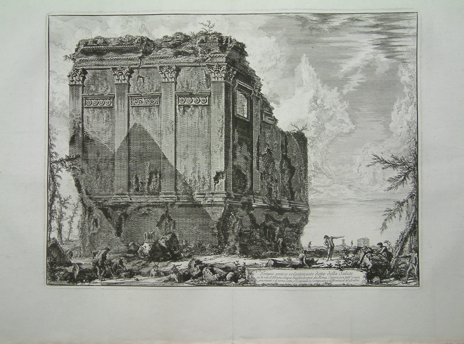 Luigi Rossini (1790-1857) was a native of Ravenna but soon moved to Bologna where he became an assistant to Antonio Basoli at 18 years old. At 24 he moved to Rome he put to use his study of architecture. Being a great admirer of Piranesi he turned to the art of etching and emulated him as much as possible. ‘Le Antichita Romane’ was first published in 1823. Berlin Kat. 1916.