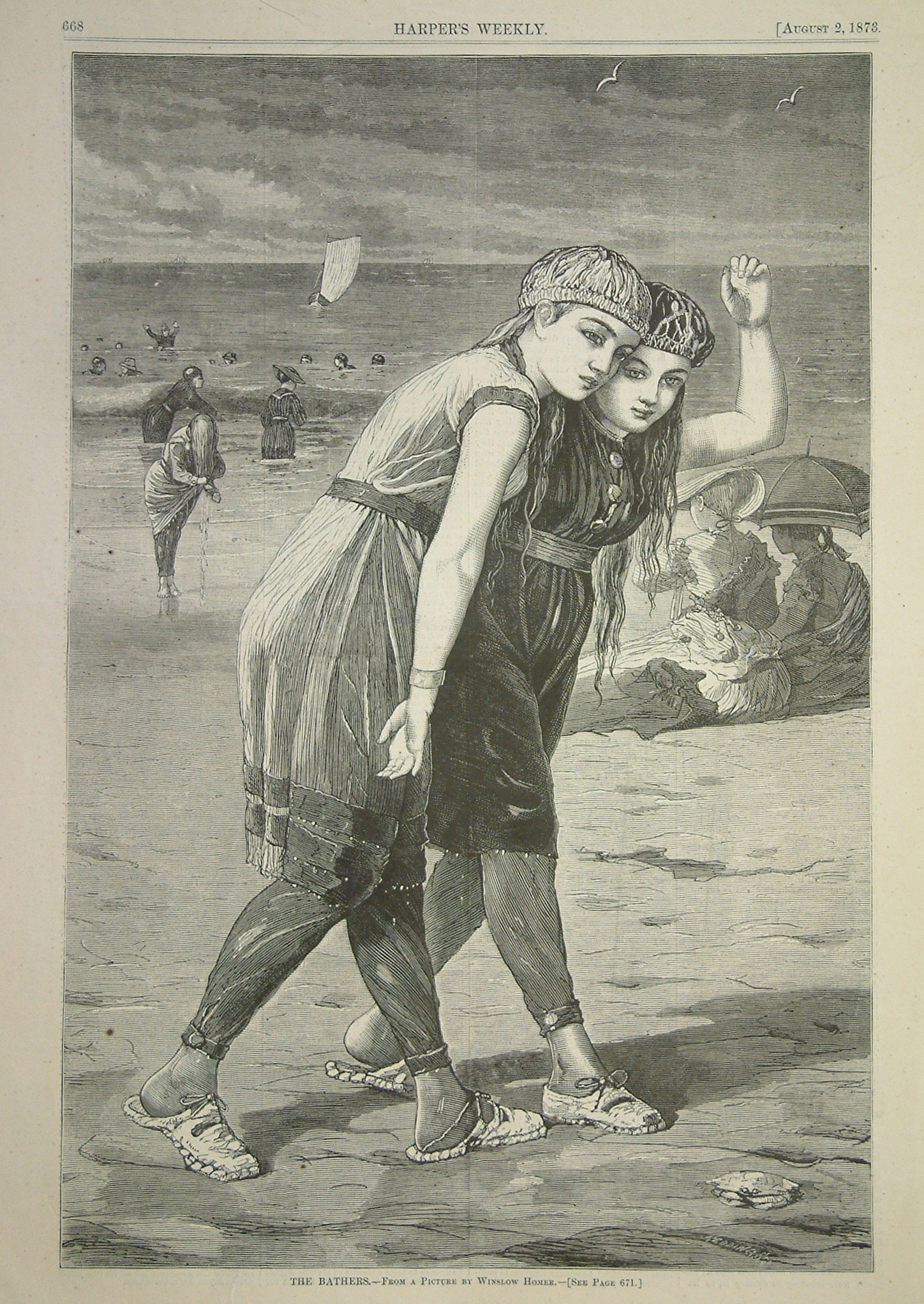 Winslow Homer (1836-1910) began his artistic career as a graphic designer. His famous oil and watercolour paintings were produced in the second half of his life when he had moved to Prout’s Neck, Maine, and lived in virtual seclusion. Before that, Homer was America’s best known and most popular illustrator and his engravings appeared regularly in numerous national magazines. They illustrated American life in cities, on the farm, at the front during the Civil War, at the seaside, in the Adirondacks, and the White Mountains, at sea and in the harbour. At their best, Homer’s techniques in his engravings became important parts of his paintings. Foster ”A Check List’ of Illustrations of Winslow Homer in Harper’s Weekly and other Periodicals’, New York Public Library, 1936; Gelman “The Wood Engravings of Winslow Homer, NY, 1969.