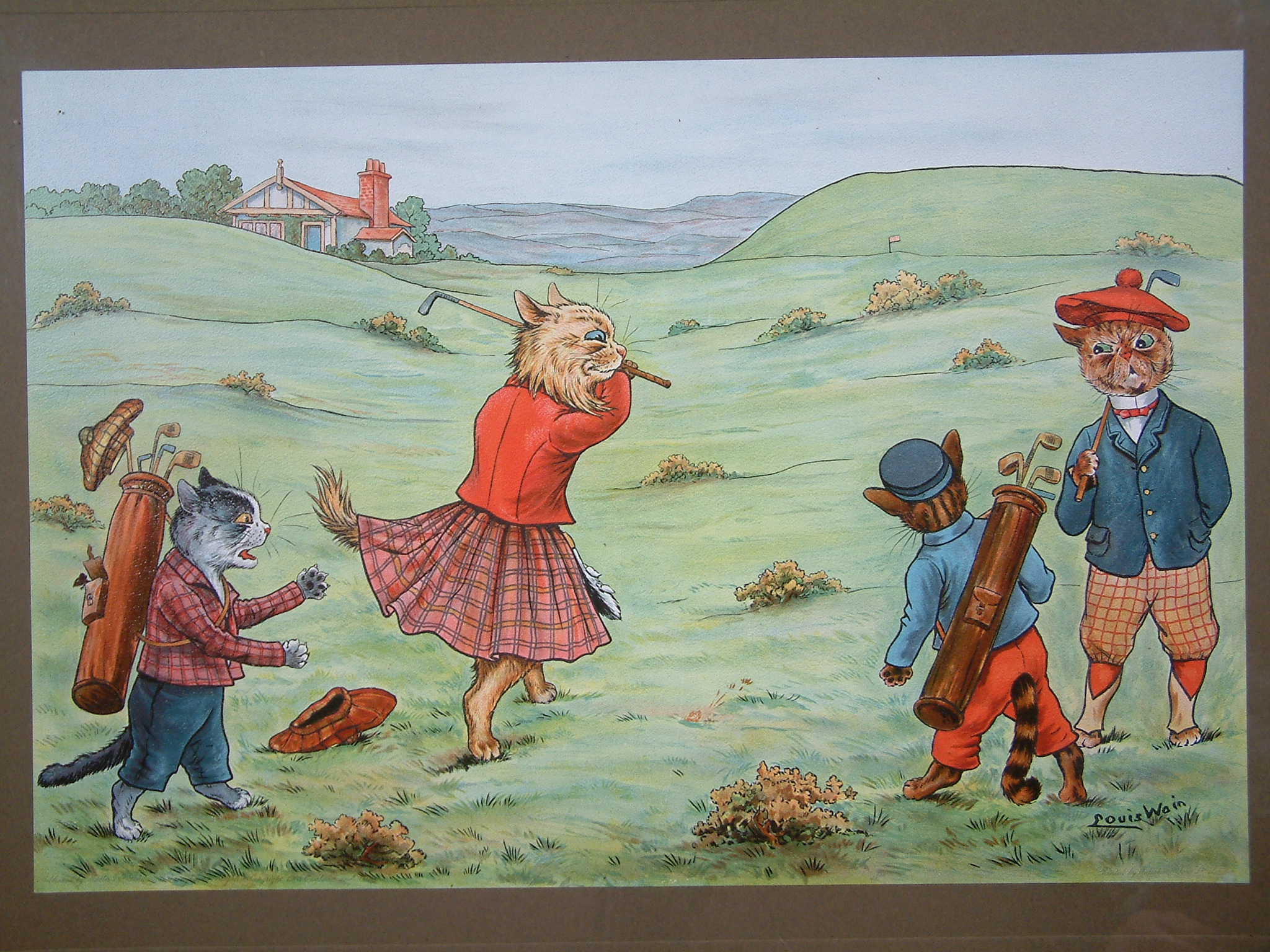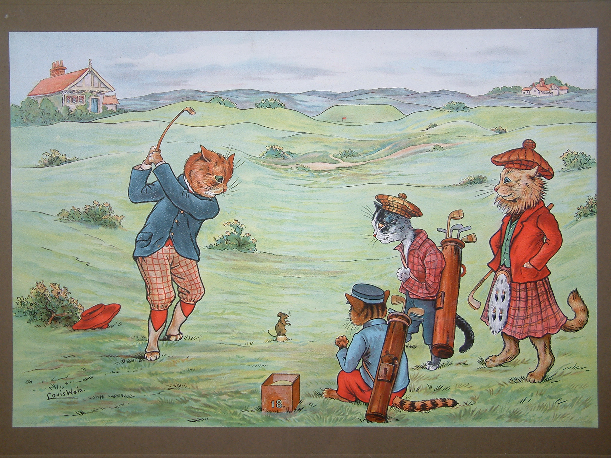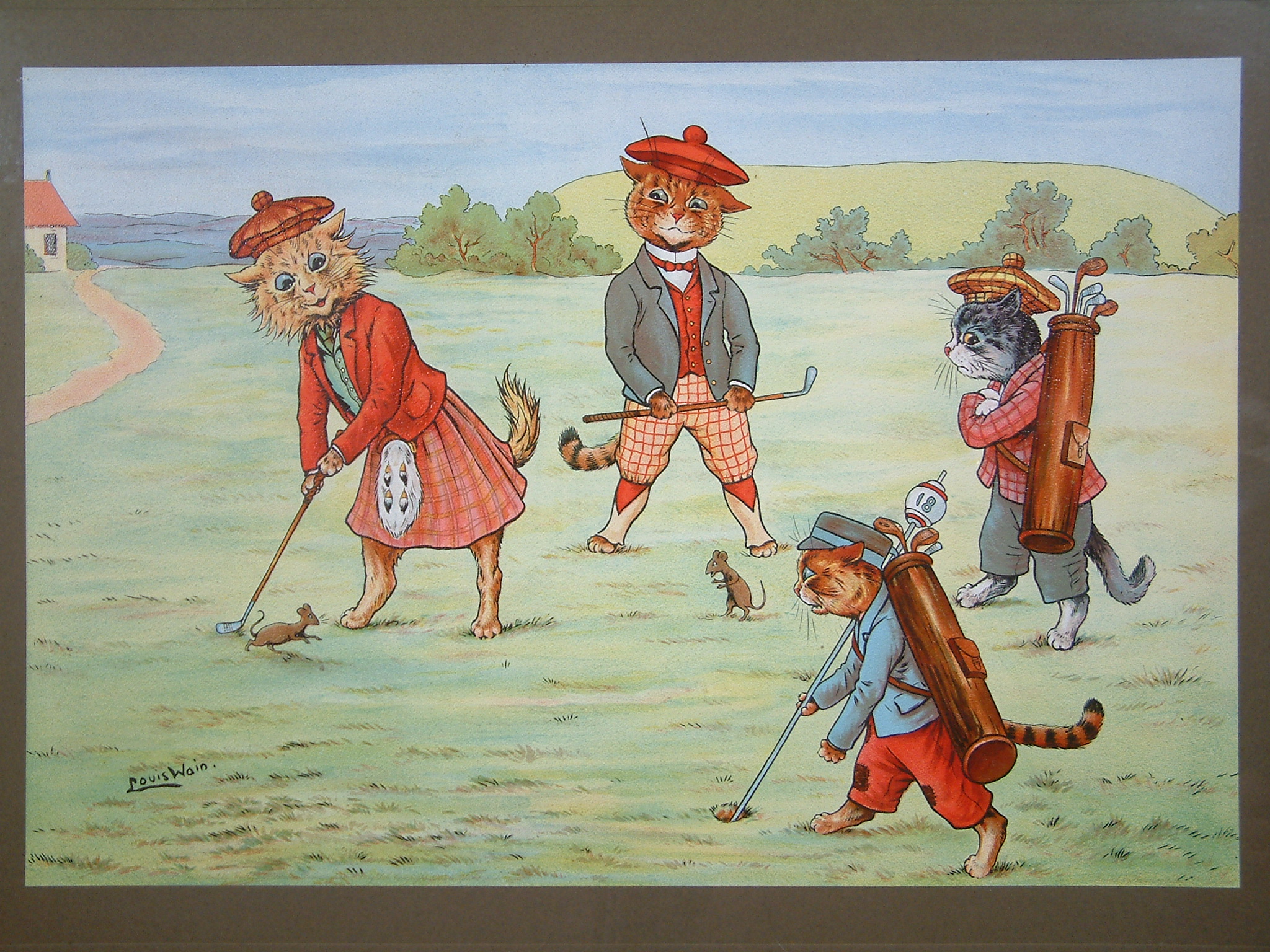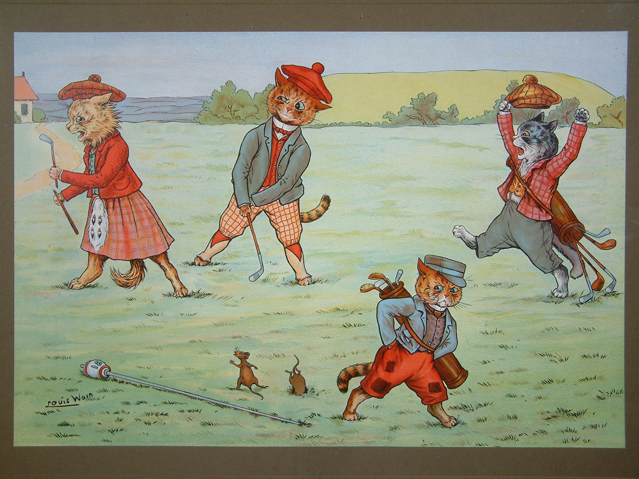 Louis Wain (1860-1939) was a tragic artist who suffered schizophrenia. The early part of his career produced art of fanciful cats engaged in human activity. This is what he is known for, his love of cats. Professionally trained, at 24 he married Emily Richardson who tragically was struck down with breast cancer shortly after the wedding. To amuse his bedridden wife, Louis bought a black and white kitten and spent hours sketching his antics. Emily was enchanted and persuaded him to submit them to the ‘Illustrated London News’. He was at first reluctant but the editor loved them. Our love of cats today is almost entirely due to Louis Wain, up to that point their purpose was not as pets but more to control vermin. Emily died before seeing his major success. He never found another soulmate. In 1890 he produced on a whim his first anthropomorphic cats putting them in clothes. He drew them playing cards, cricket, boxing, golf etc.