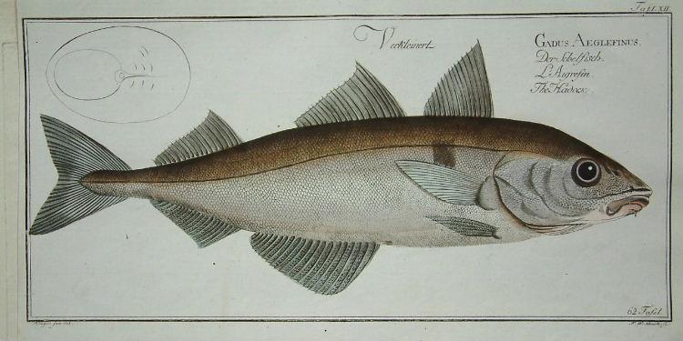 Marcus Eliezer Bloch (1723-99) practised as a physician in Berlin. His professional interest in fishes came late in his life at the age of 56. His first scientific work of note was a treatise on intestinal worms which won him a prize from the Academy of Copenhagen. His monumental work entitled ‘Allgemeine Naturgeschichte der Fische’ is ‘possibly the most beautiful book on fishes ever published’ (Dance). Amongst his supporters was Frederick the Great. According to Wood ‘one of the early and fundamental treatises on general ichthyology by a well-known authority’. Many of the plates were heightened in silver by which means Bloch sought to reproduce the sheen of the fish. Dance (1990) p. 56; Nissen ZBI (1978) 416; Wood (2002) p. 244.