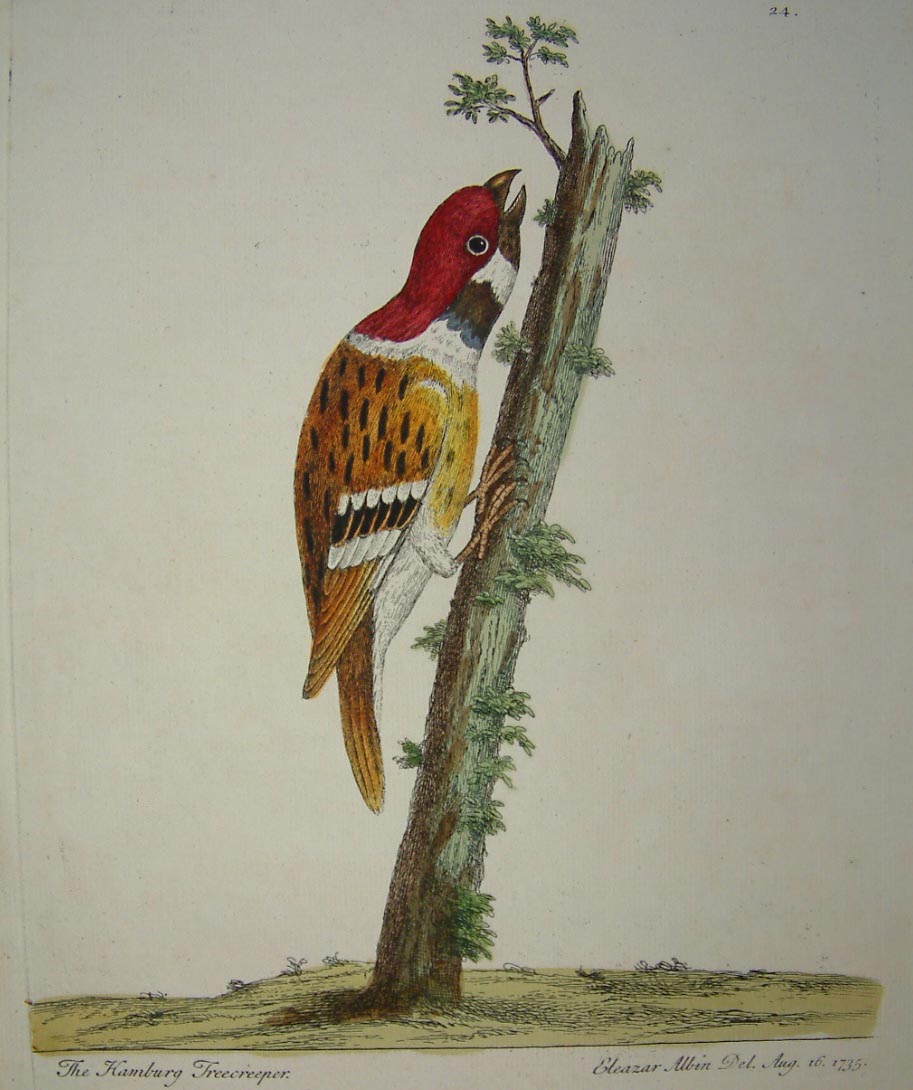 Eleazar Albin’s ‘Natural History of Birds’ is the first colour plate bird book to be printed. Mark Catesby’s ‘Natural History’ began publication in the same year but that work was not completed until 1747 and it was not purely a bird book. Little is known about Albin; he was a teacher of watercolour and drawing. He admits that he was drawn to natural history by the rich and vibrant colours found in birds, plants and insects. Anker (1979) 4; Fine Bird Books (1990) 54; Nissen (1976) IVB 14.