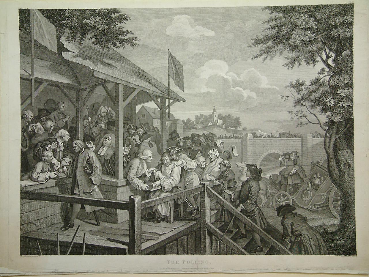 William Hogarth (1697-1764) is ‘considered to be the father of English caricature’ (Feaver). Hogarth began life in the hardest of ways with four years spent with his family in Fleet Prison; his father being a bankrupt teacher from the north of England. Aged seventeen he was apprenticed to a silver engraver before setting up as an engraver of trade cards. His free style of engraving which was his fresh perspective on the world around him found few admirers in the traditional markets. He took to subscription to reach a wider audience producing such classic series as “Marriage a la Mode”, “The Rake’s Progress”, “Industry and Idleness” amongst others. Despite his own highly inflaming political prints it was parliament which eventually granted his wish of a copyright law protecting the works of artists such as himself. John and Josiah Boydell later collected the drawing into the ‘Original Works of William Hogarth’, first published in 1790. Clayton (1997); Feaver (1988).