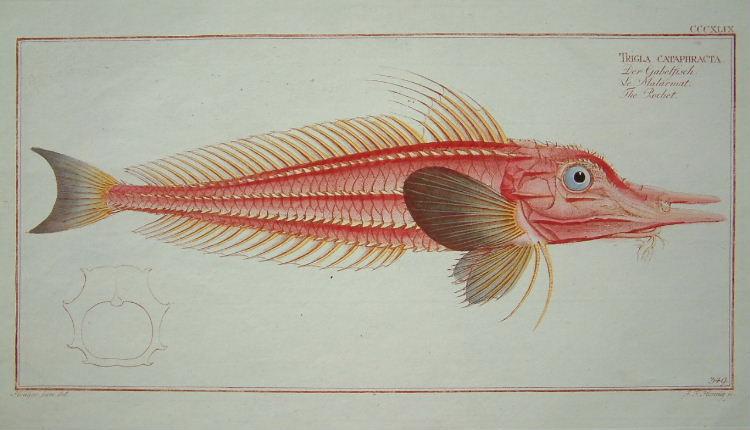 Marcus Eliezer Bloch (1723-99) practised as a physician in Berlin. His professional interest in fishes came late in his life at the age of 56. His first scientific work of note was a treatise on intestinal worms which won him a prize from the Academy of Copenhagen. His monumental work entitled ‘Allgemeine Naturgeschichte der Fische’ is ‘possibly the most beautiful book on fishes ever published’ (Dance). Amongst his supporters was Frederick the Great. According to Wood ‘one of the early and fundamental treatises on general ichthyology by a well-known authority’. Many of the plates were heightened in silver by which means Bloch sought to reproduce the sheen of the fish. Dance (1990) p. 56; Nissen ZBI (1978) 416; Wood (2002) p. 244.