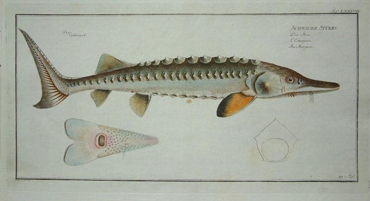 Marcus Eliezer Bloch (1723-99) practised as a physician in Berlin. His professional interest in fishes came late in his life at the age of 56. His first scientific work of note was a treatise on intestinal worms which won him a prize from the Academy of Copenhagen. His monumental work entitled ‘Allgemeine Naturgeschichte der Fische’ is ‘possibly the most beautiful book on fishes ever published’ (Dance). Amongst his supporters was Frederick the Great. According to Wood ‘one of the early and fundamental treatises on general ichthyology by a well-known authority’. Many of the plates were heightened in silver by which means Bloch sought to reproduce the sheen of the fish. Dance (1990) p. 56; Nissen ZBI (1978) 416; Wood (2002) p. 244.