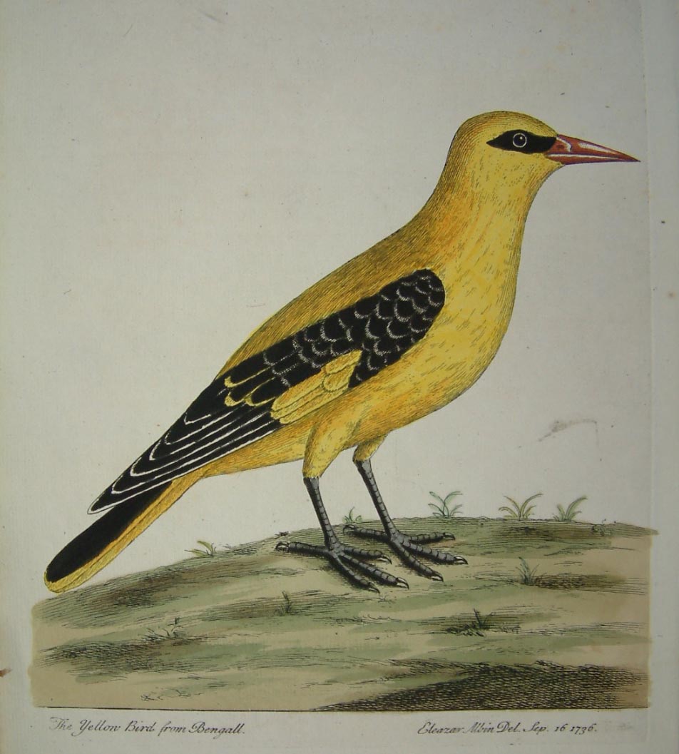 Eleazar Albin’s ‘Natural History of Birds’ is the first colour plate bird book to be printed. Mark Catesby’s ‘Natural History’ began publication in the same year but that work was not completed until 1747 and it was not purely a bird book. Little is known about Albin; he was a teacher of watercolour and drawing. He admits that he was drawn to natural history by the rich and vibrant colours found in birds, plants and insects. Anker (1979) 4; Fine Bird Books (1990) 54; Nissen (1976) IVB 14.