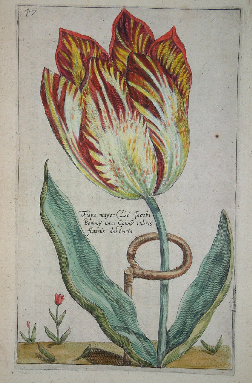 The ‘Hortus Floridus’ by Crispijn van de Passe (1594/5-1670) was ‘without question the most popular florilegium ever published’ (Oak Spring Flora). Although van de Passe produced a technically accurate work which became an indispensable reference work his artistic talents were also expressed well. Many of his plates were unique for the period in displaying the plants in their natural surroundings rather than floating on a blank page. He is also noted for introducing insect life and even the odd animal to his images. Van de Passe was the son of an engraver of the same name. Ref. Hunt (1958) 199; Nissen BBI (1966) 1494; ‘Oak Spring Flora’ no. 12.