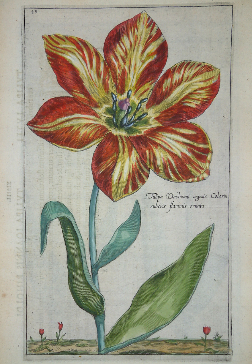 The ‘Hortus Floridus’ by Crispijn van de Passe (1594/5-1670) was ‘without question the most popular florilegium ever published’ (Oak Spring Flora). Although van de Passe produced a technically accurate work which became an indispensable reference work his artistic talents were also expressed well. Many of his plates were unique for the period in displaying the plants in their natural surroundings rather than floating on a blank page. He is also noted for introducing insect life and even the odd animal to his images. Van de Passe was the son of an engraver of the same name. Ref. Hunt (1958) 199; Nissen BBI (1966) 1494; ‘Oak Spring Flora’ no. 12.