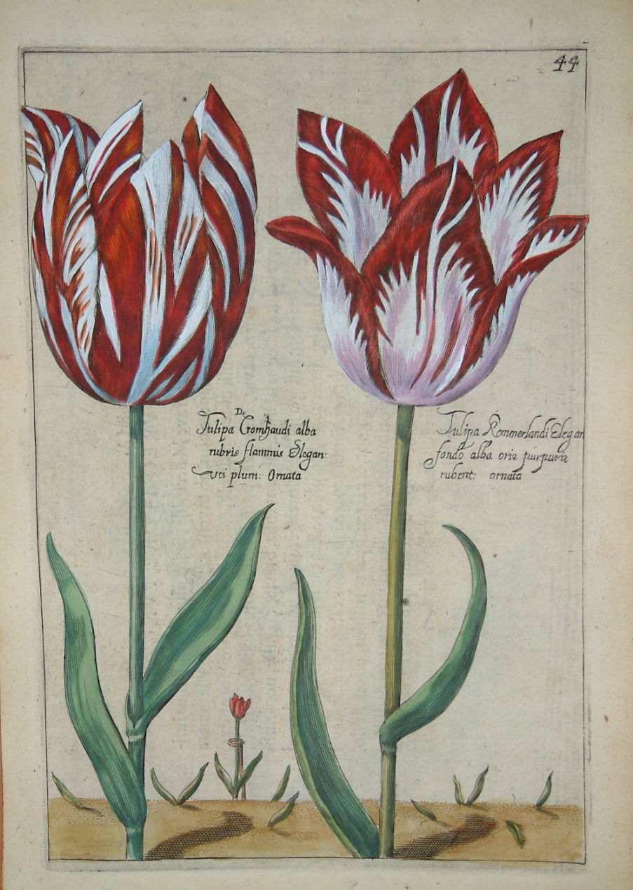 The ‘Hortus Floridus’ by Crispijn van de Passe (1594/5-1670) was ‘without question the most popular florilegium ever published’ (Oak Spring Flora). Although van de Passe produced a technically accurate work which became an indispensable reference work his artistic talents were also expressed well. Many of his plates were unique for the period in displaying the plants in their natural surroundings rather than floating on a blank page. He is also noted for introducing insect life and even the odd animal to his images. Van de Passe was the son of an engraver of the same name. Ref. Hunt (1958) 199; Nissen BBI (1966) 1494; ‘Oak Spring Flora’ no. 12.