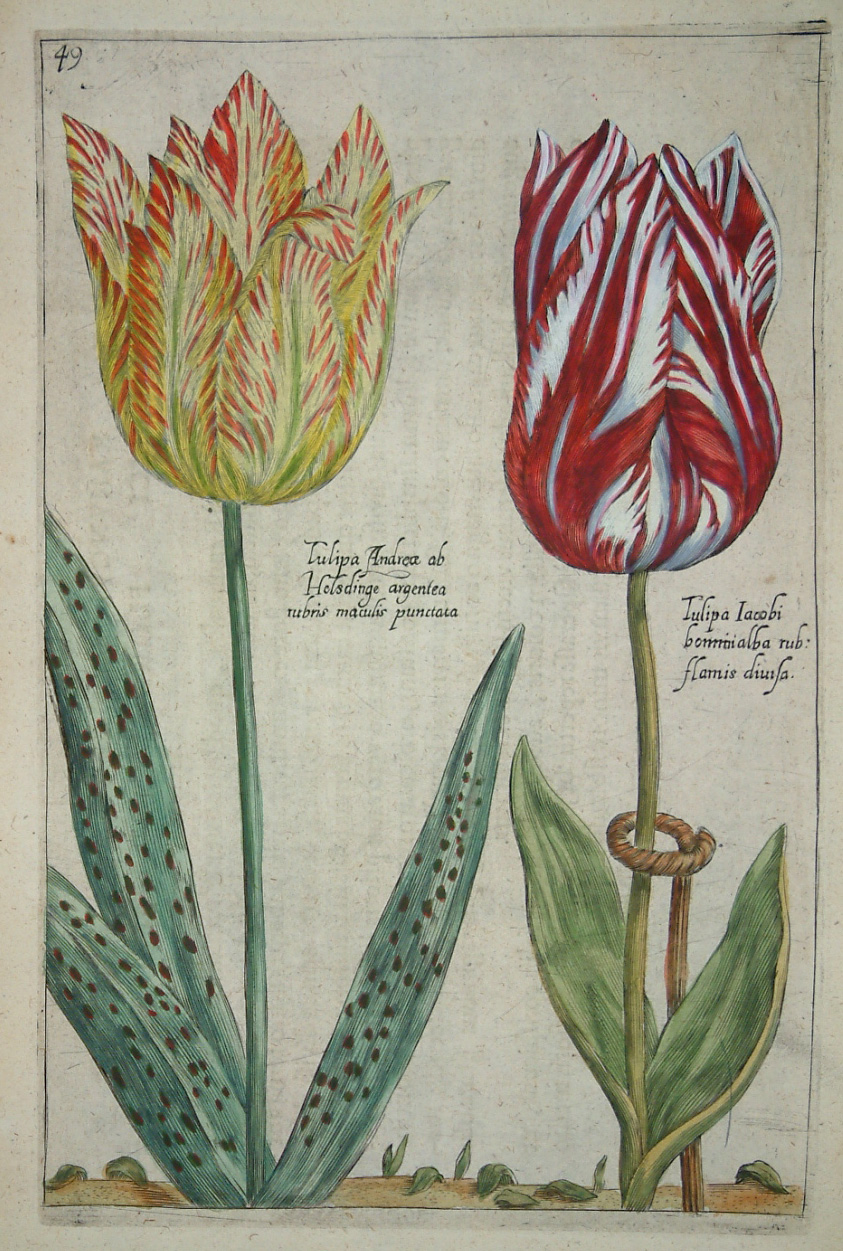 The ‘Hortus Floridus’ by Crispijn van de Passe (1594/5-1670) was ‘without question the most popular florilegium ever published’ (Oak Spring Flora). Although van de Passe produced a technically accurate work which became an indispensable reference work his artistic talents were also expressed well. Many of his plates were unique for the period in displaying the plants in their natural surroundings rather than floating on a blank page. He is also noted for introducing insect life and even the odd animal to his images. Van de Passe was the son of an engraver of the same name. Ref. Hunt (1958) 199; Nissen BBI (1966) 1494; ‘Oak Spring Flora’ no. 12.