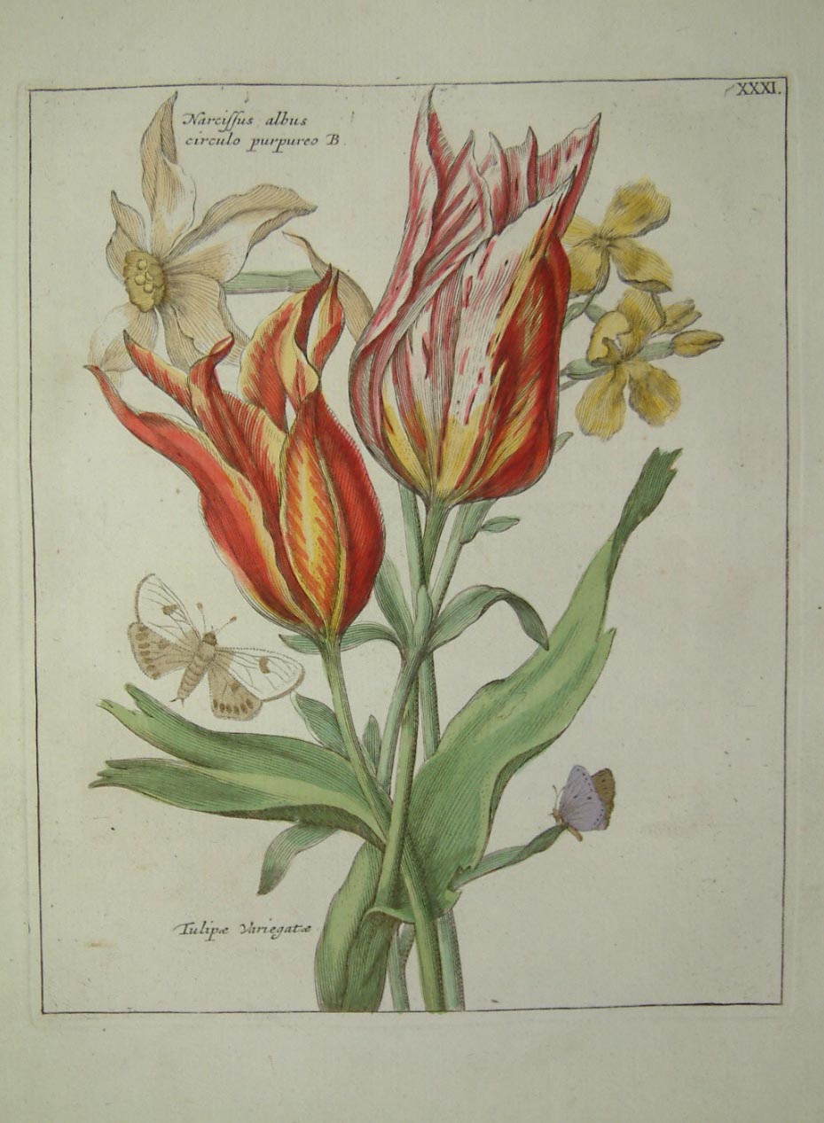 The publishers of the rare ‘Nederlandsche Bloemwerk’ were members of the society of Dutch nurserymen. The author of this work is unknown and it is usually listed under its title. The work was issued to subscribers, only 66 are named. Both Nissen and Plesch assign the engraving to Paul Theodor can Brussel (1754-95), though he signs only one plate. The bugs, caterpillars and moths are reminiscent of the work of Maria Sibylla Merian. Dunthorne (1938) 215; ‘Great Flower Books’ (1956) p. 47; Hunt (1958) 733; Landwehr (1976) 29; Nissen BBI (1966) 2219.