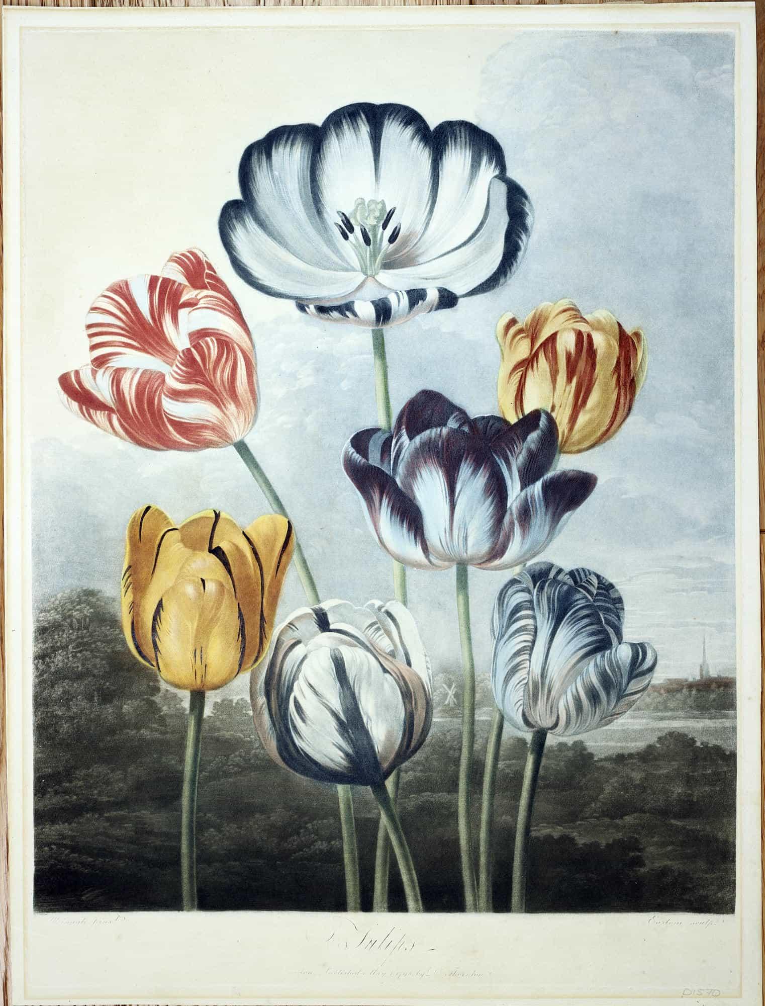 Robert John Thornton’s ‘Temple of Flora’ is undoubtedly the most famous English botanical plate book ever produced. It was first issued in parts between the years 1799 and 1807 then as a book in 1807 before the famous lottery edition in 1811. The work was intended as a pictorial celebration of the sexual system of Linnaeus and was accompanied by prose and verse. Thornton (1768-1837) employed the finest artists, engravers, printers and colourists in its production. Its production exhausted his fortune and he turned to Parliament for permission to run a lottery to pay his debts. Each plant is in an exotic or romantic setting. Dunthorne (1938) 301; ‘Great Flower Books’ (1956) p. 77; Grigson and Buchanan (1951).