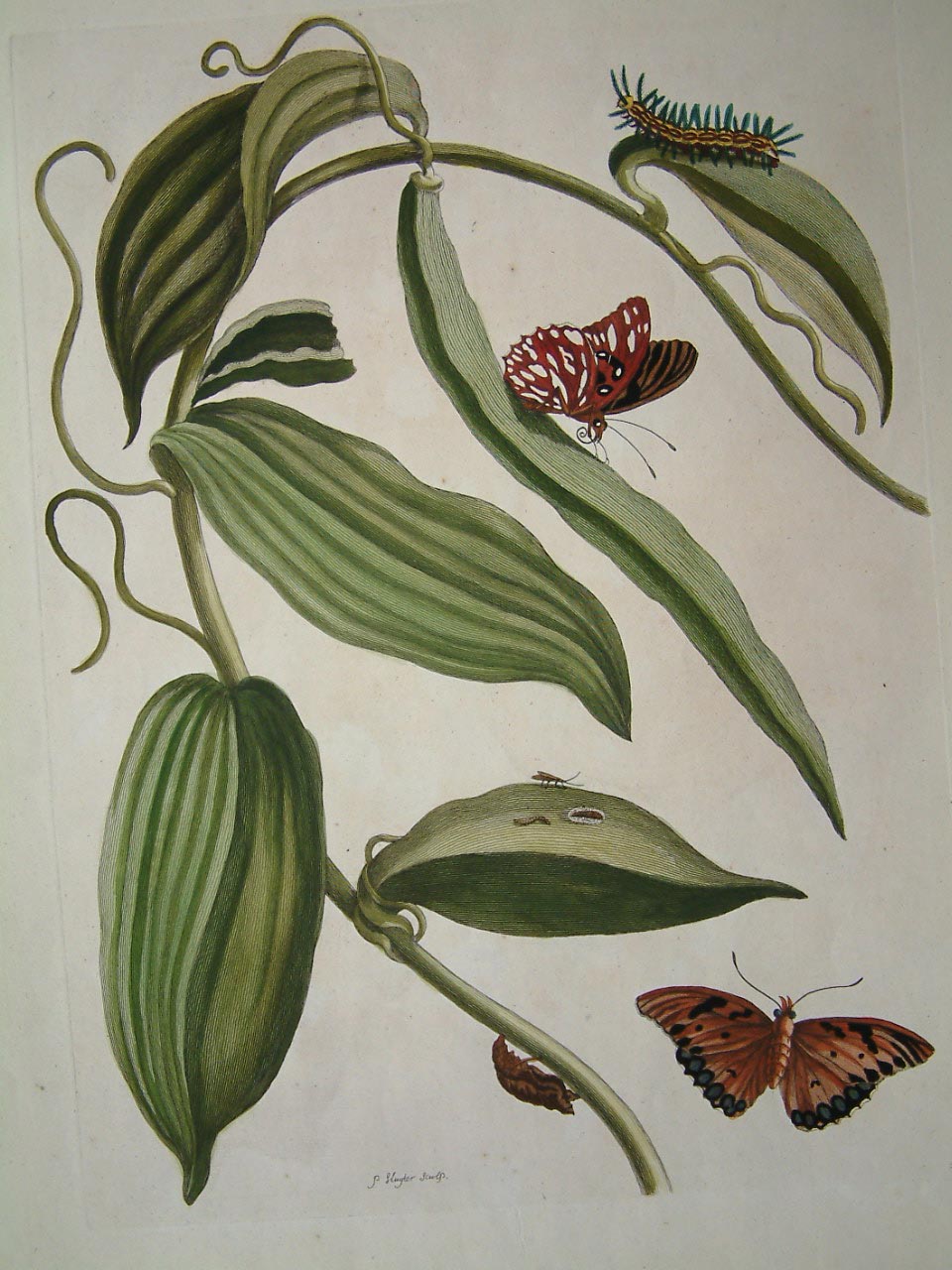 Maria Sibylla Merian (1647-1717) is most famous for two published works, the ‘Dissertatio de Generatione et Metamorphosibus Insectorum Surinamensium’ first published in 1705 and ‘De Europische Insecten’ of 1730, both published in Amsterdam. Maria was the daughter of Matthias Merian (1593-1650) a noted engraver and publisher. She devoted her life to the study of insects and their metamorphoses. Noting the fascinating insects returning from the Dutch colony in South America, she set sail with her daughter Dorothea in 1699 for Surinam where she remained until 1701. Her work was the first to show the European public the beauty and wealth of the insect life in the region. The various stages of caterpillar and butterfly are all shown amongst native flora and fruiting plants. The daughter Maria returned to Surinam to complete with work which was expanded with 12 further plates and published two years after her mother’s death in 1719. A third edition appeared in 1726. Dunthorne (1938) 205; ‘Great Flower Books’ (1956) p. 67; Hunt (1958) 467; Landwehr (1976) 131; Nissen (1966) 1341.