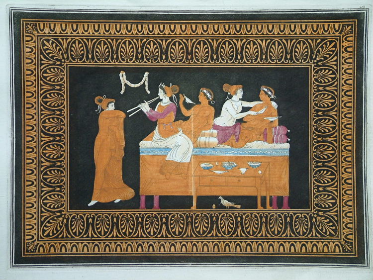 Sir William Hamilton (1730-1803) was a diplomat and British Ambassador to the Kingdom of Naples from 1764-1800. He was also an antiquarian, archaeologist and vulcanologist. Immediately after his arrival in Naples Hamilton began collecting vases and other antiquities. In 1766-67 he published the ‘Antiquités Étrusques, Grecques et Romanes. Tirées du Cabinet de M. Hamilton’ with sumptuous plates of the designs found. The collection was later sold to the British Museum. Pierre-Francois Hugues d’Hancarville (1719-1805) who wrote the text, acquired a similar passion for classical art. He became a close friend of Johann Winckelmann (1717-68) to whom the second volume is dedicated. Winckelmann is best known for his excavations at Pompeii and Herculaneum. Hamilton’s brother-in-law Lord Cathcart lent some proofs of the plates to Josiah Wedgewood (1730-95) just as he was building his new factory at Etruria and they had a profound effect on him. In June 1769 Wedgewood celebrated the opening by throwing six black vases which were hand-painted in red caustic enamel with three figures taken from Hamilton’s book. Hamilton’s other claim to fame is his second wife, Lady Emma Hamilton (1765-1815), mistress to Lord Nelson. Blackmer Collection (1989) 845; Berlin Catalogue (1939) 890; Cohen-de Ricci (1997) 474.