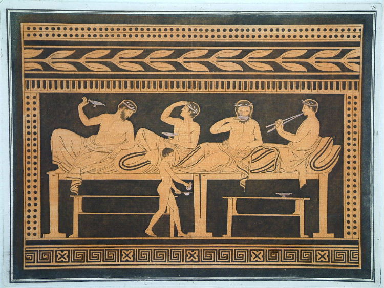 Sir William Hamilton (1730-1803) was a diplomat and British Ambassador to the Kingdom of Naples from 1764-1800. He was also an antiquarian, archaeologist and vulcanologist. Immediately after his arrival in Naples Hamilton began collecting vases and other antiquities. In 1766-67 he published the ‘Antiquités Étrusques, Grecques et Romanes. Tirées du Cabinet de M. Hamilton’ with sumptuous plates of the designs found. The collection was later sold to the British Museum. Pierre-Francois Hugues d’Hancarville (1719-1805) who wrote the text, acquired a similar passion for classical art. He became a close friend of Johann Winckelmann (1717-68) to whom the second volume is dedicated. Winckelmann is best known for his excavations at Pompeii and Herculaneum. Hamilton’s brother-in-law Lord Cathcart lent some proofs of the plates to Josiah Wedgewood (1730-95) just as he was building his new factory at Etruria and they had a profound effect on him. In June 1769 Wedgewood celebrated the opening by throwing six black vases which were hand-painted in red caustic enamel with three figures taken from Hamilton’s book. Hamilton’s other claim to fame is his second wife, Lady Emma Hamilton (1765-1815), mistress to Lord Nelson. Blackmer Collection (1989) 845; Berlin Catalogue (1939) 890; Cohen-de Ricci (1997) 474.