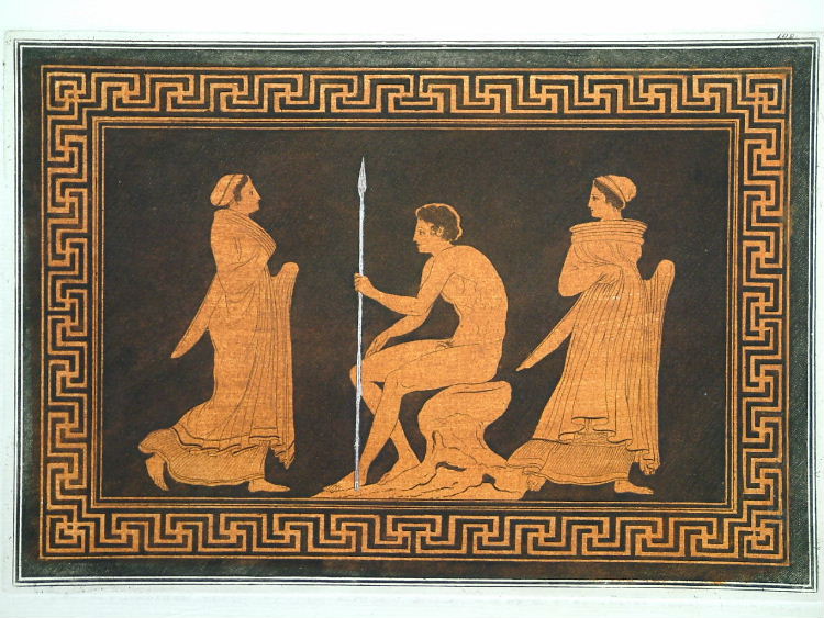 Sir William Hamilton (1730-1803) was a diplomat and British Ambassador to the Kingdom of Naples from 1764-1800. He was also an antiquarian, archaeologist and vulcanologist. Immediately after his arrival in Naples Hamilton began collecting vases and other antiquities. In 1766-67 he published the ‘Antiquités Étrusques, Grecques et Romanes. Tirées du Cabinet de M. Hamilton’ with sumptuous plates of the designs found. The collection was later sold to the British Museum. Pierre-Francois Hugues d’Hancarville (1719-1805) who wrote the text, acquired a similar passion for classical art. He became a close friend of Johann Winckelmann (1717-68) to whom the second volume is dedicated. Winckelmann is best known for his excavations at Pompeii and Herculaneum. Hamilton’s brother-in-law Lord Cathcart lent some proofs of the plates to Josiah Wedgewood (1730-95) just as he was building his new factory at Etruria and they had a profound effect on him. In June 1769 Wedgewood celebrated the opening by throwing six black vases which were hand-painted in red caustic enamel with three figures taken from Hamilton’s book. Hamilton’s other claim to fame is his second wife, Lady Emma Hamilton (1765-1815), mistress to Lord Nelson. Blackmer Collection (1989) 845; Berlin Catalogue (1939) 890; Cohen-de Ricci (1997) 474.