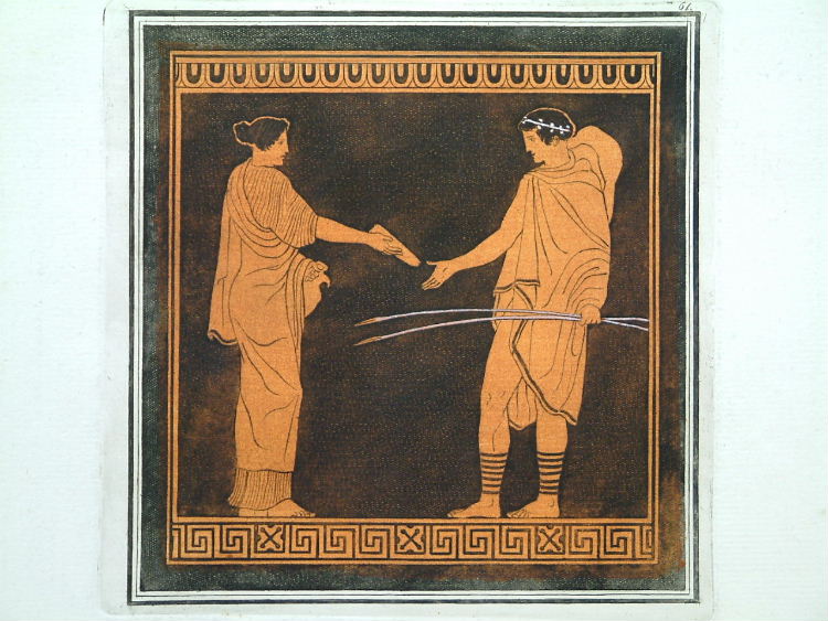Sir William Hamilton (1730-1803) was a diplomat and British Ambassador to the Kingdom of Naples from 1764-1800. He was also an antiquarian, archaeologist and vulcanologist. Immediately after his arrival in Naples Hamilton began collecting vases and other antiquities. In 1766-67 he published the ‘Antiquités Étrusques, Grecques et Romanes. Tirées du Cabinet de M. Hamilton’ with sumptuous plates of the designs found. The collection was later sold to the British Museum. Pierre-Francois Hugues d’Hancarville (1719-1805) who wrote the text, acquired a similar passion for classical art. He became a close friend of Johann Winckelmann (1717-68) to whom the second volume is dedicated. Winckelmann is best known for his excavations at Pompeii and Herculaneum. Hamilton’s brother-in-law Lord Cathcart lent some proofs of the plates to Josiah Wedgewood (1730-95) just as he was building his new factory at Etruria and they had a profound effect on him. In June 1769 Wedgewood celebrated the opening by throwing six black vases which were hand-painted in red caustic enamel with three figures taken from Hamilton’s book. Hamilton’s other claim to fame is his second wife, Lady Emma Hamilton (1765-1815), mistress to Lord Nelson. Blackmer Collection (1989) 845; Berlin Catalogue (1939) 890; Cohen-de Ricci (1997) 474.