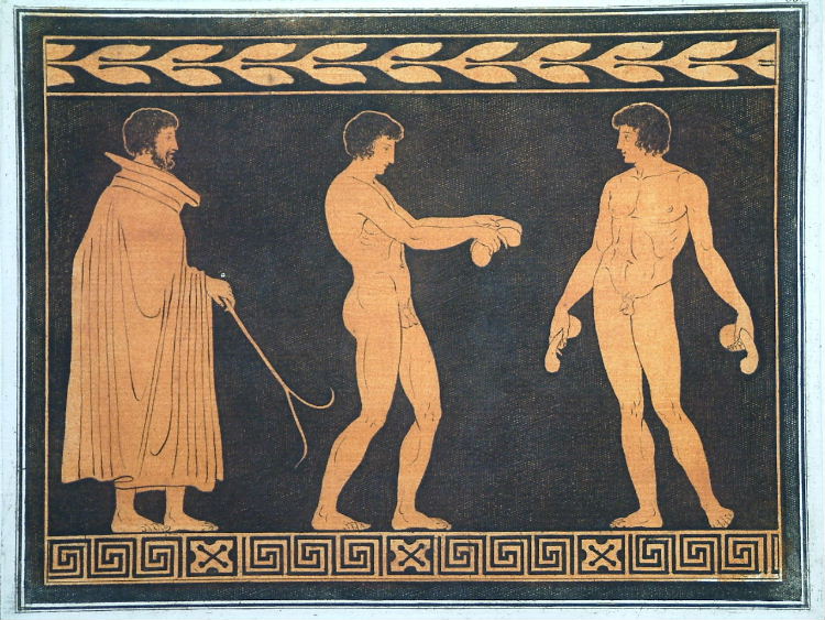 Sir William Hamilton (1730-1803) was a diplomat and British Ambassador to the Kingdom of Naples from 1764-1800. He was also an antiquarian, archaeologist and vulcanologist. Immediately after his arrival in Naples Hamilton began collecting vases and other antiquities. In 1766-67 he published the ‘Antiquités Étrusques, Grecques et Romanes. Tirées du Cabinet de M. Hamilton’ with sumptuous plates of the designs found. The collection was later sold to the British Museum. Pierre-Francois Hugues d’Hancarville (1719-1805) who wrote the text, acquired a similar passion for classical art. He became a close friend of Johann Winckelmann (1717-68) to whom the second volume is dedicated. Winckelmann is best known for his excavations at Pompeii and Herculaneum. Hamilton’s brother-in-law Lord Cathcart lent some proofs of the plates to Josiah Wedgewood (1730-95) just as he was building his new factory at Etruria and they had a profound effect on him. In June 1769 Wedgewood celebrated the opening by throwing six black vases which were hand-painted in red caustic enamel with three figures taken from Hamilton’s book. Hamilton’s other claim to fame is his second wife, Lady Emma Hamilton (1765-1815), mistress to Lord Nelson. Blackmer Collection (1989) 845; Berlin Catalogue (1939) 890; Cohen-de Ricci (1997) 474.