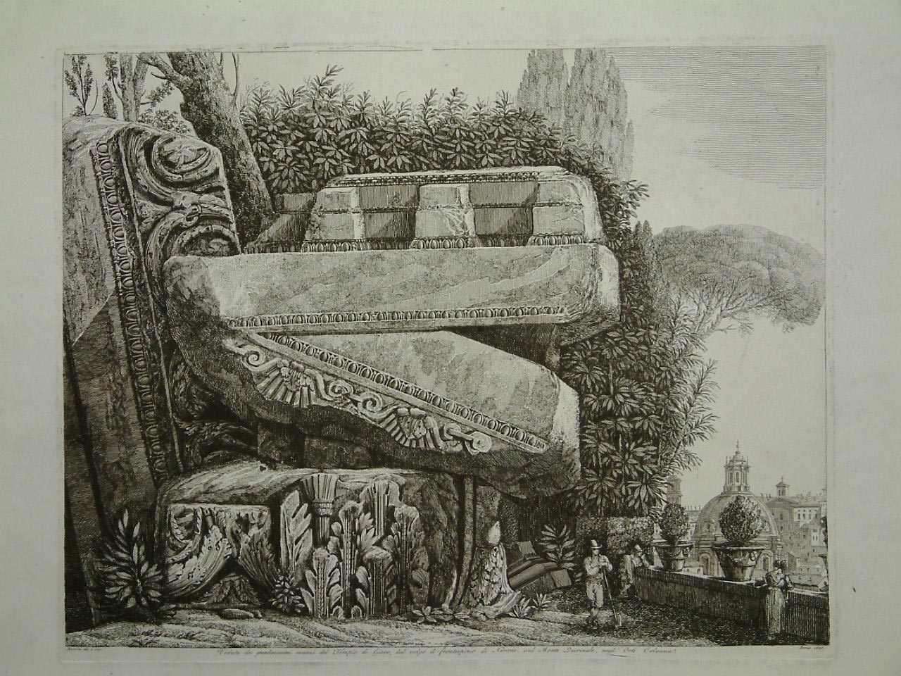 Luigi Rossini (1790-1857) was a native of Ravenna but soon moved to Bologna where he became an assistant to Antonio Basoli at 18 years old. At 24 he moved to Rome he put to use his study of architecture. Being a great admirer of Piranesi he turned to the art of etching and emulated him as much as possible. ‘Le Antichita Romane’ was first published in 1823. Berlin Kat. 1916.