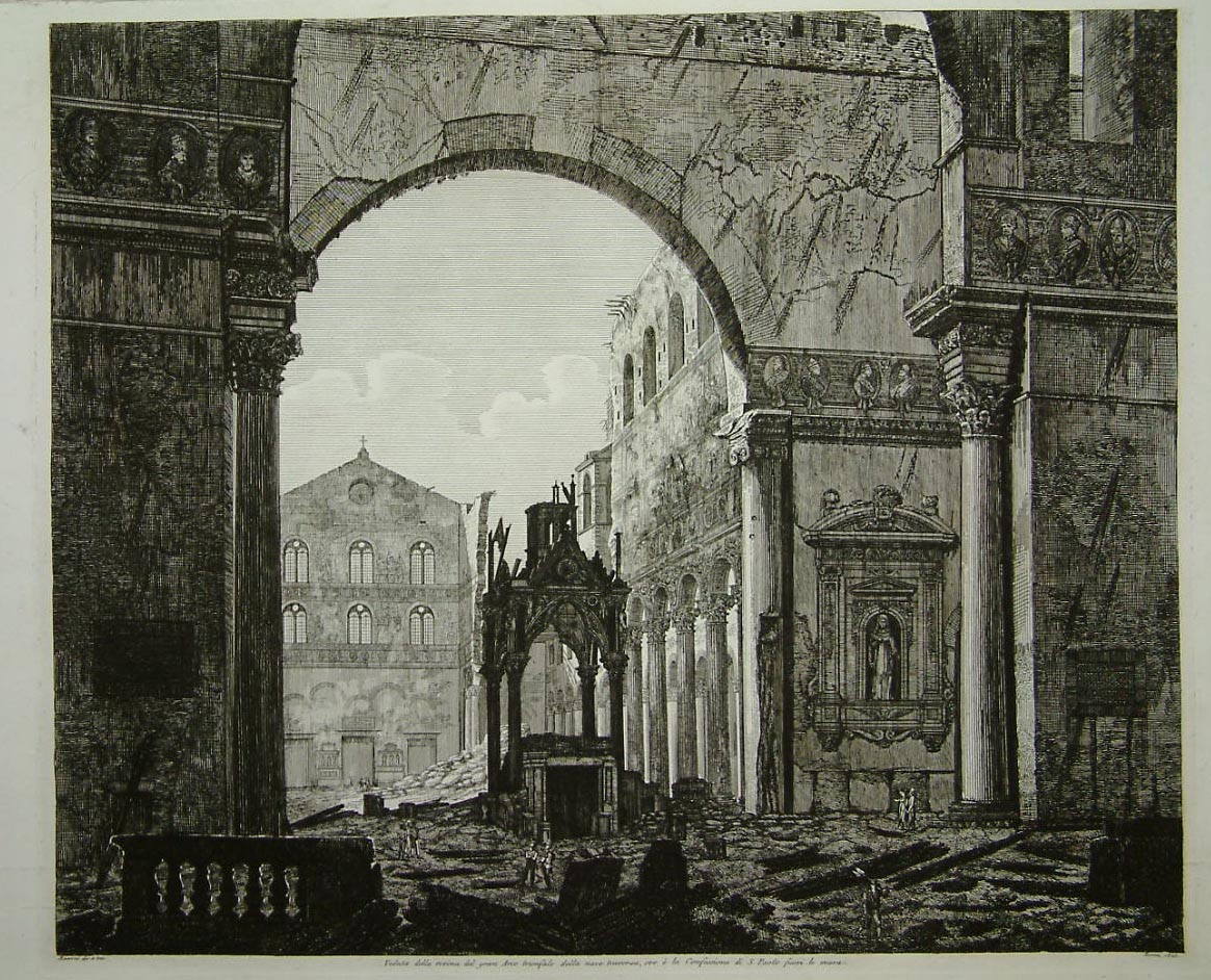 Luigi Rossini (1790-1857) was a native of Ravenna but soon moved to Bologna where he became an assistant to Antonio Basoli at 18 years old. At 24 he moved to Rome he put to use his study of architecture. Being a great admirer of Piranesi he turned to the art of etching and emulated him as much as possible. ‘Le Antichita Romane’ was first published in 1823. Berlin Kat. 1916.