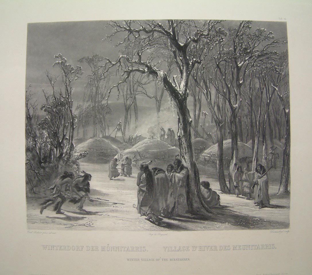 This is undoubtedly the finest plate book on Native American Indians ever published. The artist Karl Bodmer (1809-93) went on the expedition of Prince Maximilian to the Plains of North America. They travelled up the Missouri River from St. Louis passing the forts of the American Fur Company. The Sioux were one of the first they encountered recording their ceremonial dances. They continued by steamer to Fort Clark studying along the way the life of the Mandan, Mintari and Crow tribes. At Fort Union they encountered the Cree and Assiniboin. This was the main base of the American Fur Company. They then proceeded through the geological beauty of the next section of the Missouri to Fort Mackenzie in present day Montana, where they spent a month building relationships with the fearsome Blackfoot tribe. As winter was setting in this was their turning point and the return journey was made downstream. The finished prints accompanied the text of Maximilian and was published as ‘Reise in das Innere Nord-America’. The quality of the engraving and the realism of the individual portraits are praised to the highest degree. Abbey ‘Travel’ (1956) 615; Howes (1962) M443a; Sabin (1868-1936) 47015; Wagner-Camp (1982) 76.2.