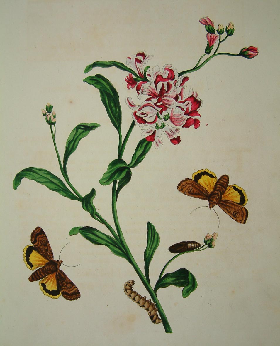 The ‘English Moths and Butterflies’ by Benjamin Wilkes (fl.1740-50) includes plates drawn from the work of the great Georg Dionysius Ehret (1708-70) and Jacob van Huysum (1687-1740). Wilkes was invited by a friend to a meeting of the Aurelian Society and became a member. He began his own collection of English lepidoptera making sketches of the various stages of metamorphoses. Joseph Dandridge, who had been a patron of Eleazer Albin (1690-1742), encouraged Wilkes to publish his notes. Lisney (1960)185-6; Nissen ZBI (1978) 4410.
